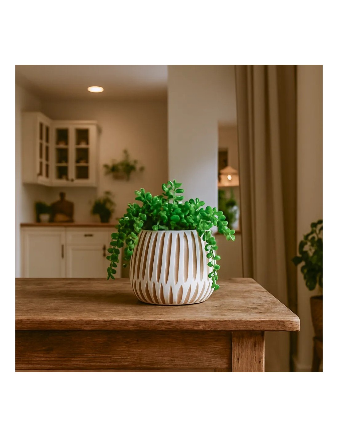 Esta maceta de madera blanca destaca por su diseño lineal grabado, que aporta ritmo visual y un acabado artesanal. Su tamaño compacto de 15x14 cm la hace ideal para plantas pequeñas, suculentas o como objeto decorativo en estanterías, escritorios o rincones luminosos. El tono blanco y la textura de las líneas permiten integrarla fácilmente en ambientes nórdicos, mediterráneos o minimalistas.