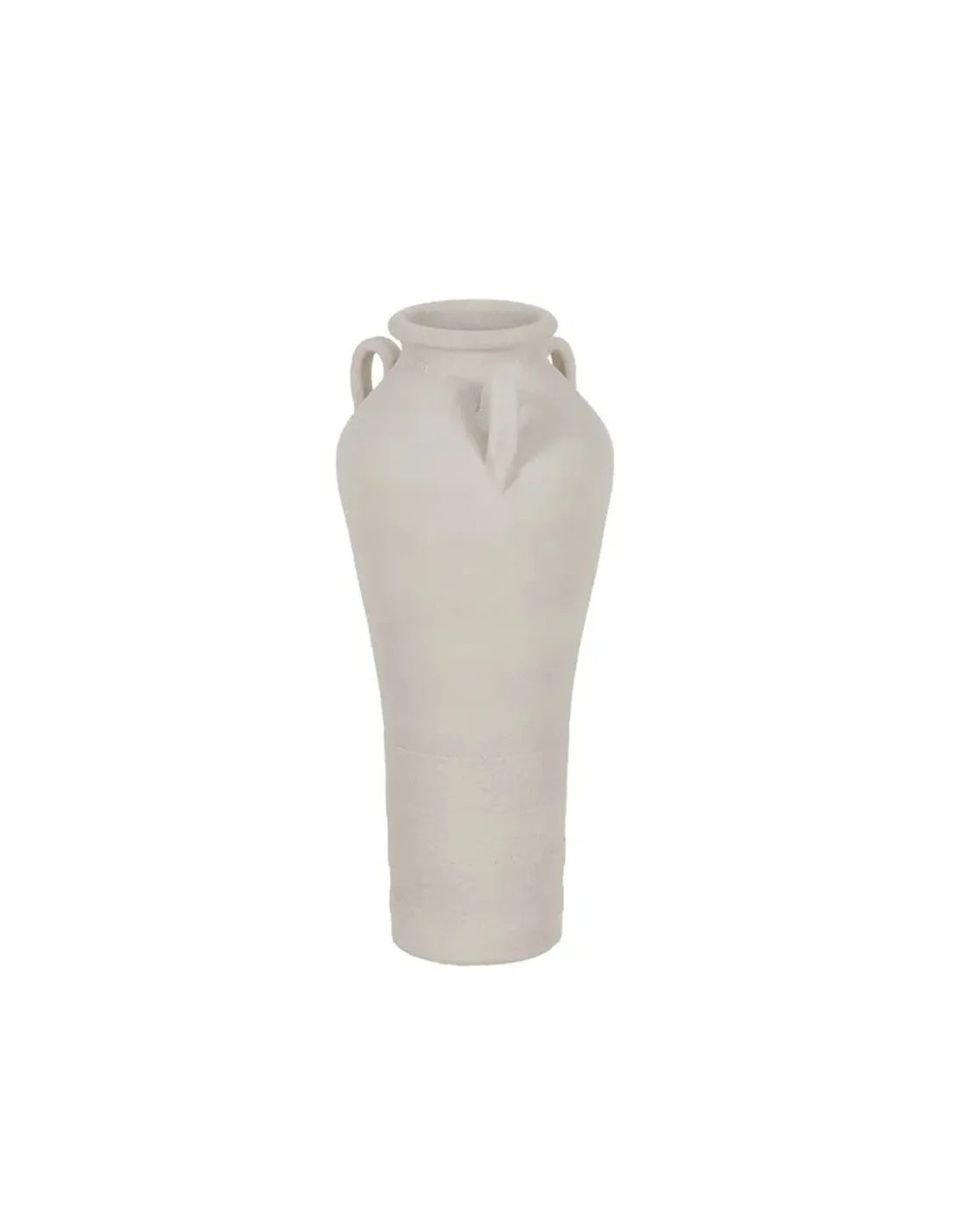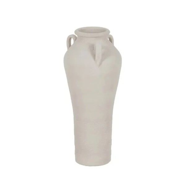 Jarrón decorativo de cerámica blanca con forma alta y cuatro asas laterales. Su diseño simétrico y escultórico aporta verticalidad y carácter artesanal a cualquier ambiente, especialmente en interiores mediterráneos, contemporáneos o minimalistas.