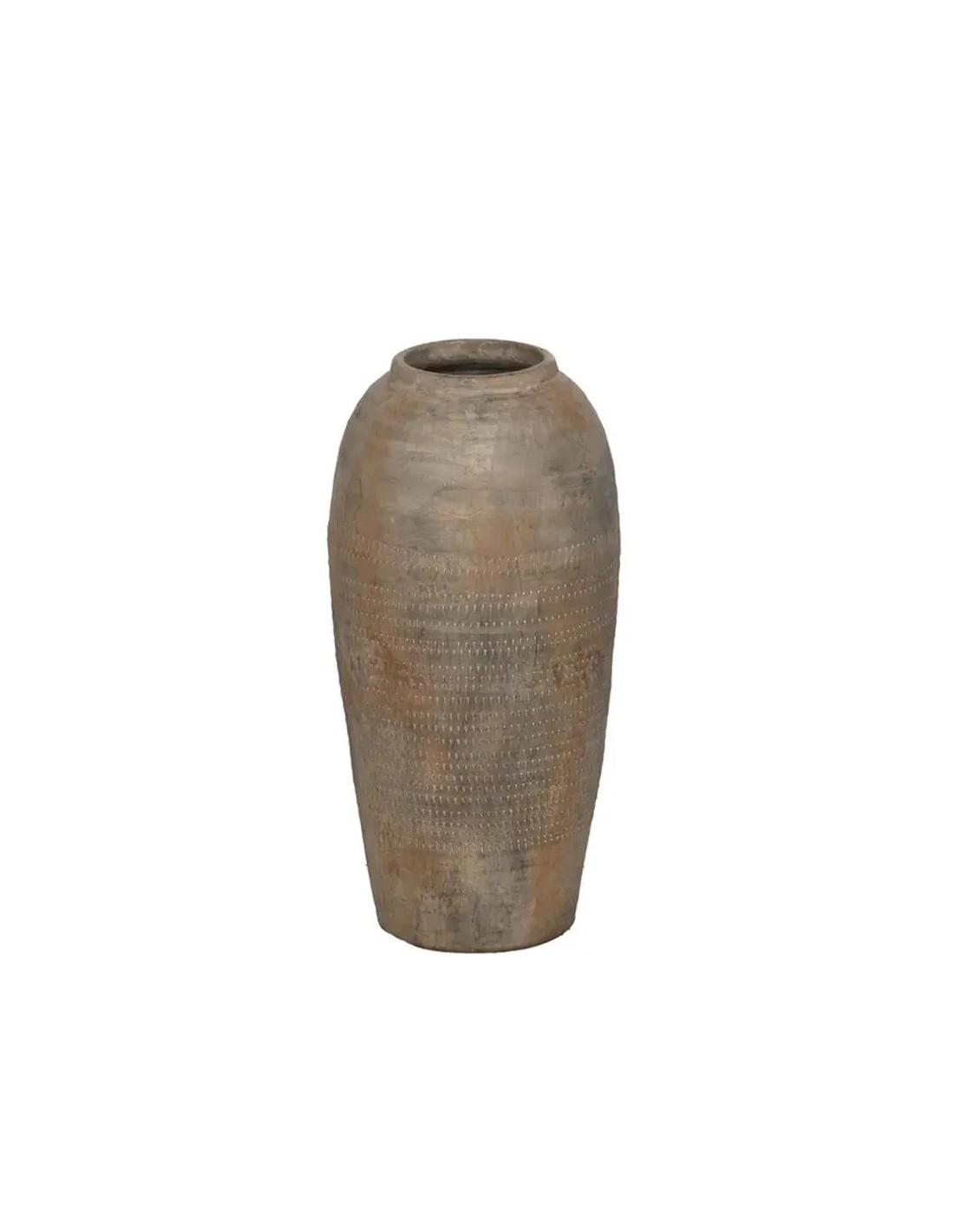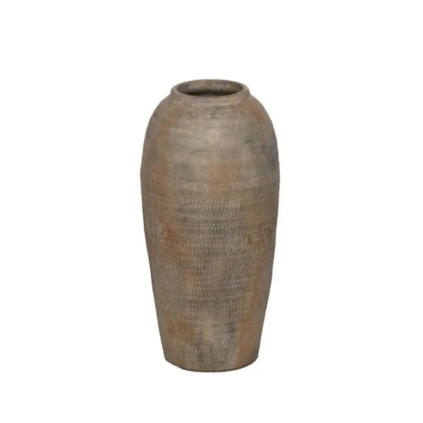 Jarrón decorativo de cerámica con forma alta y estilizada, acabado en tono gris óxido con matices minerales que aportan profundidad y carácter. Su presencia sobria y escultórica lo convierte en una pieza ideal para interiores contemporáneos, industriales o con estética wabi-sabi. Perfecto para colocar sobre consolas, aparadores o directamente en el suelo, añade verticalidad y textura sin romper la armonía del espacio. El acabado cerámico y la paleta terrosa refuerzan su autenticidad y lo convierten en un objeto decorativo de fuerte presencia visual.