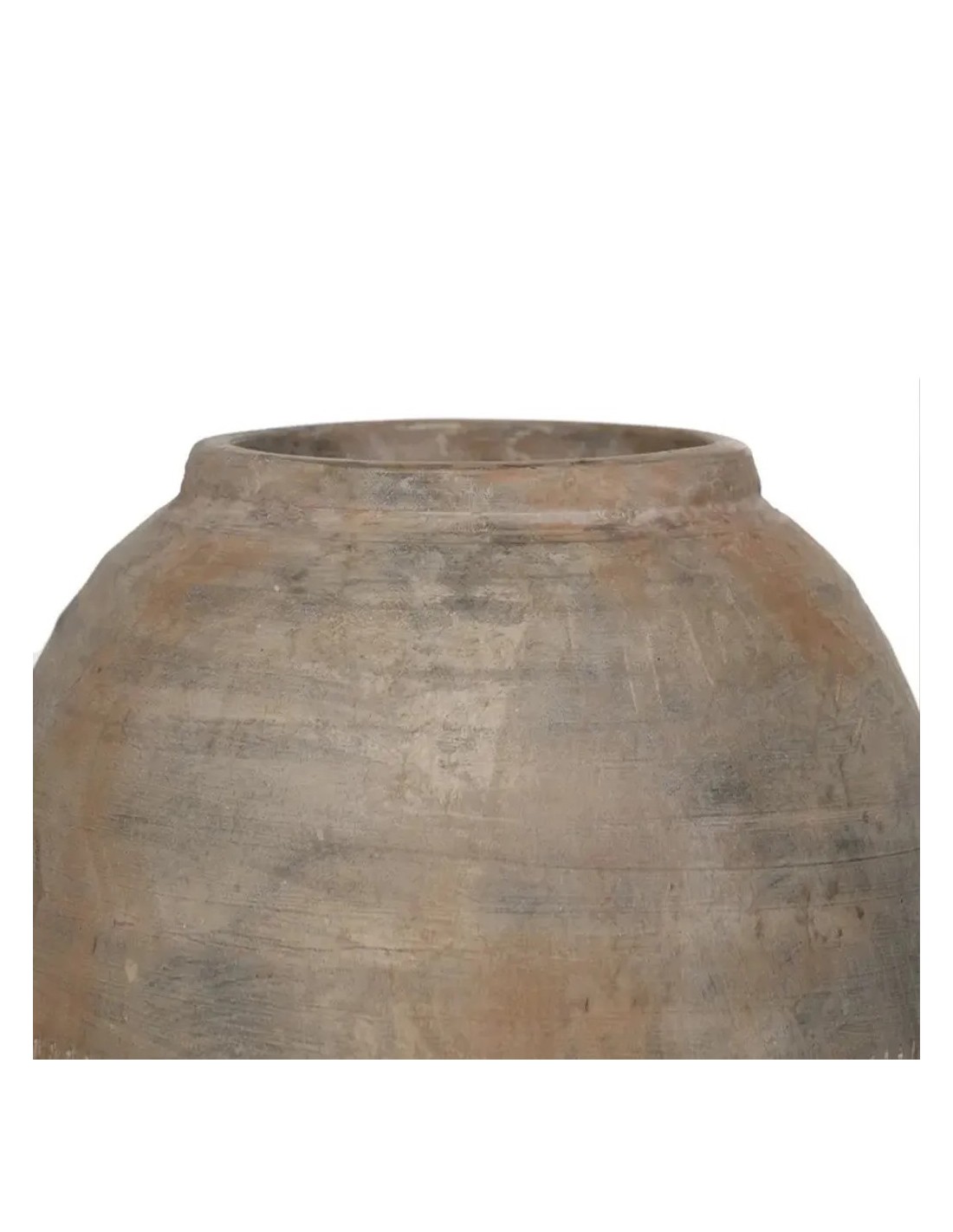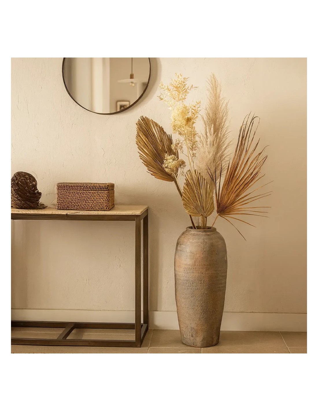 Fabricado en cerámica, este jarrón cuenta con una boca de 11 cm de diámetro. No incluye drenaje, lo que lo hace especialmente adecuado para uso decorativo o para contener ramas secas, flores preservadas o elementos naturales sin agua.
