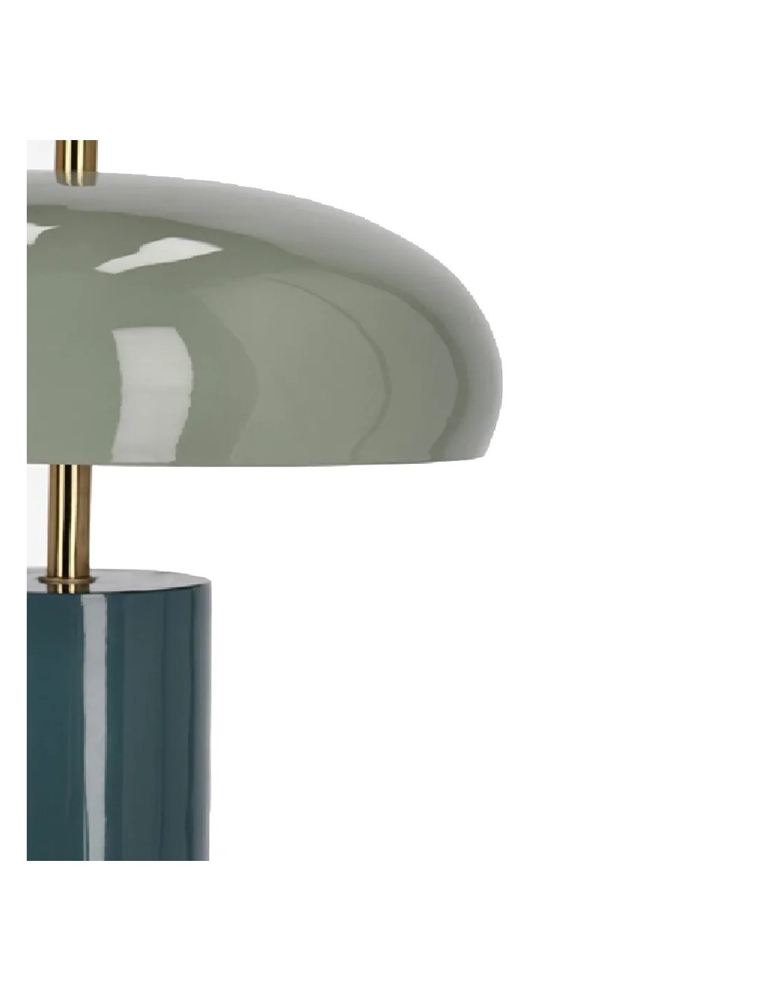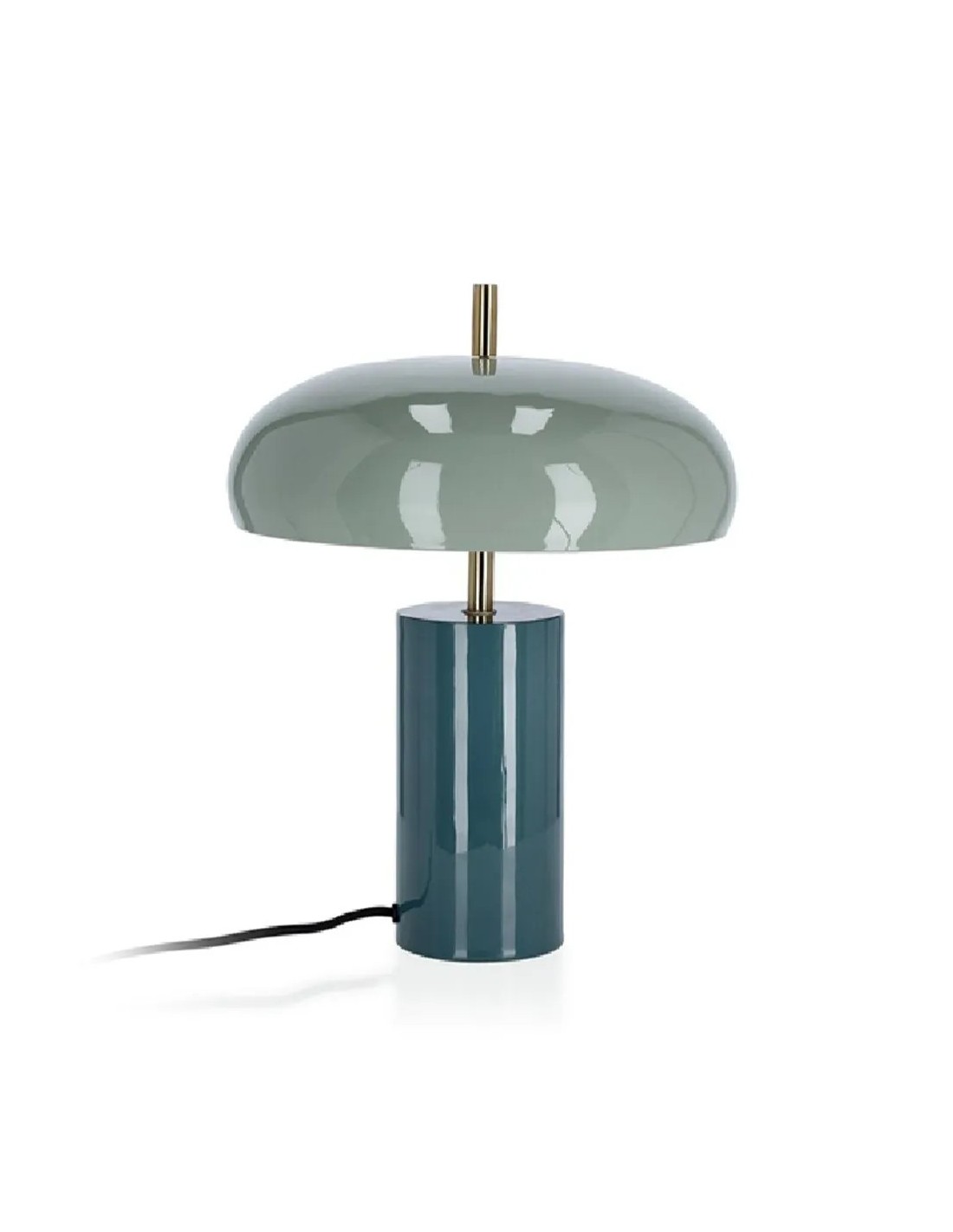 Lámpara de mesa en metal azul y dorado. Diseño compacto de 30×40 cm. Elegancia contemporánea con detalles funcionales.