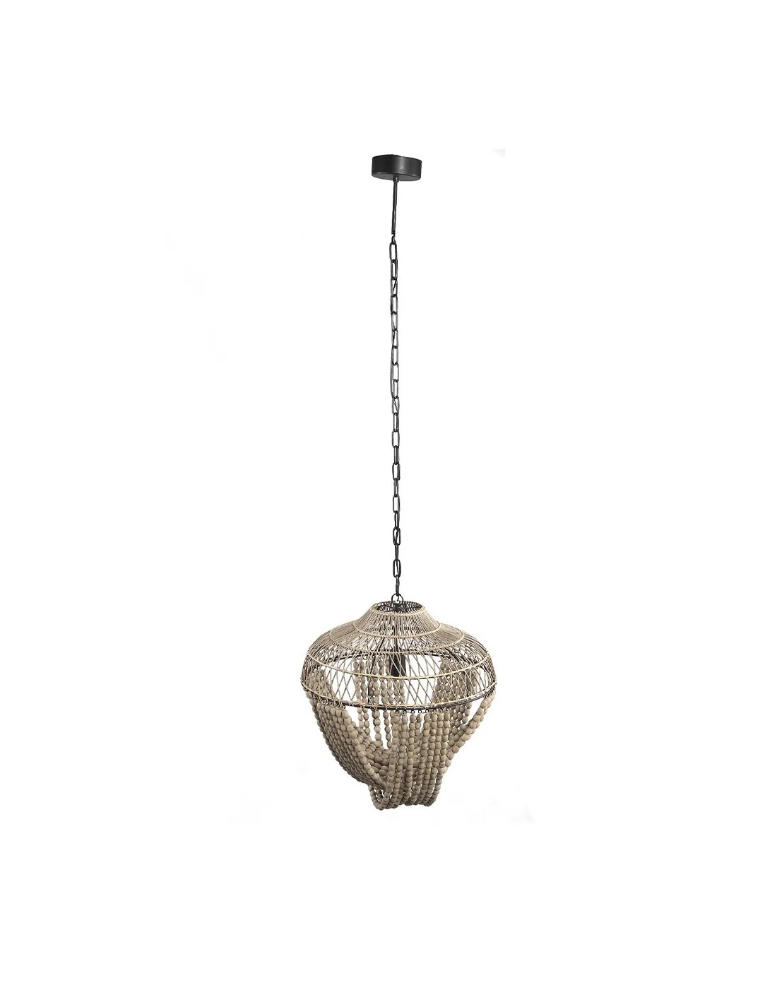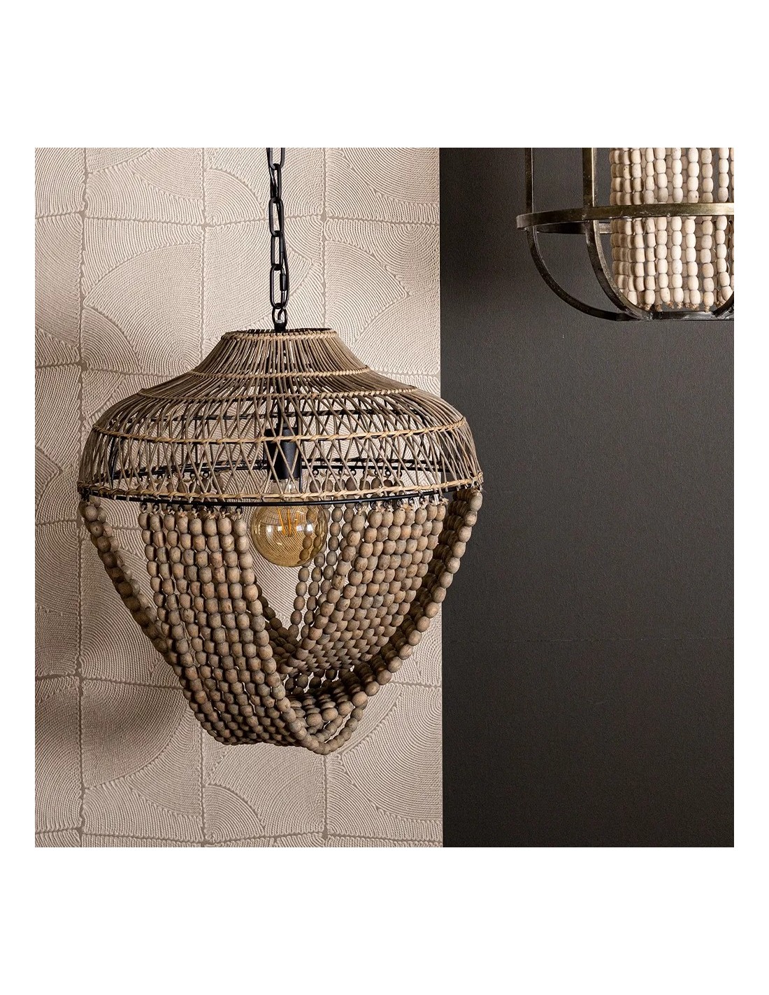 Lámpara de techo en metal negro con detalles de bolas en marrón claro. Diseño escultórico y contemporáneo que aporta carácter y sofisticación vertical al espacio.
