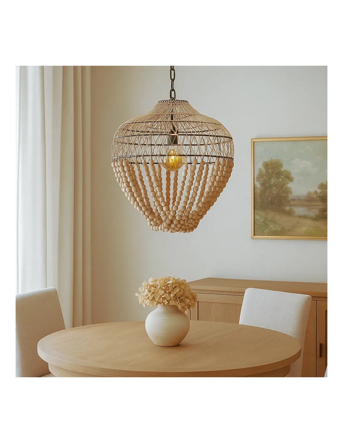 Esta lámpara de techo combina una estructura metálica negra con elementos esféricos en tono marrón claro, creando un juego visual de contraste y volumen. Con unas dimensiones de 50x157x50 cm, su formato alargado la convierte en una pieza ideal para techos altos, aportando presencia decorativa y luz envolvente. Su diseño moderno y equilibrado encaja en salones, comedores o recibidores que buscan un toque artístico y elegante. Esta lámpara de techo cuenta con una bombilla no regulable, compatible con casquillo E-27 y una potencia máxima de 40 vatios, ideal para una iluminación directa y eficiente. Su estructura se suspende mediante una cadena de 130 cm de longitud, que permite una instalación adaptable a diferentes alturas. La tapa superior tiene un diámetro de 12 cm, ofreciendo un acabado discreto y funcional que complementa el diseño general de la pieza.