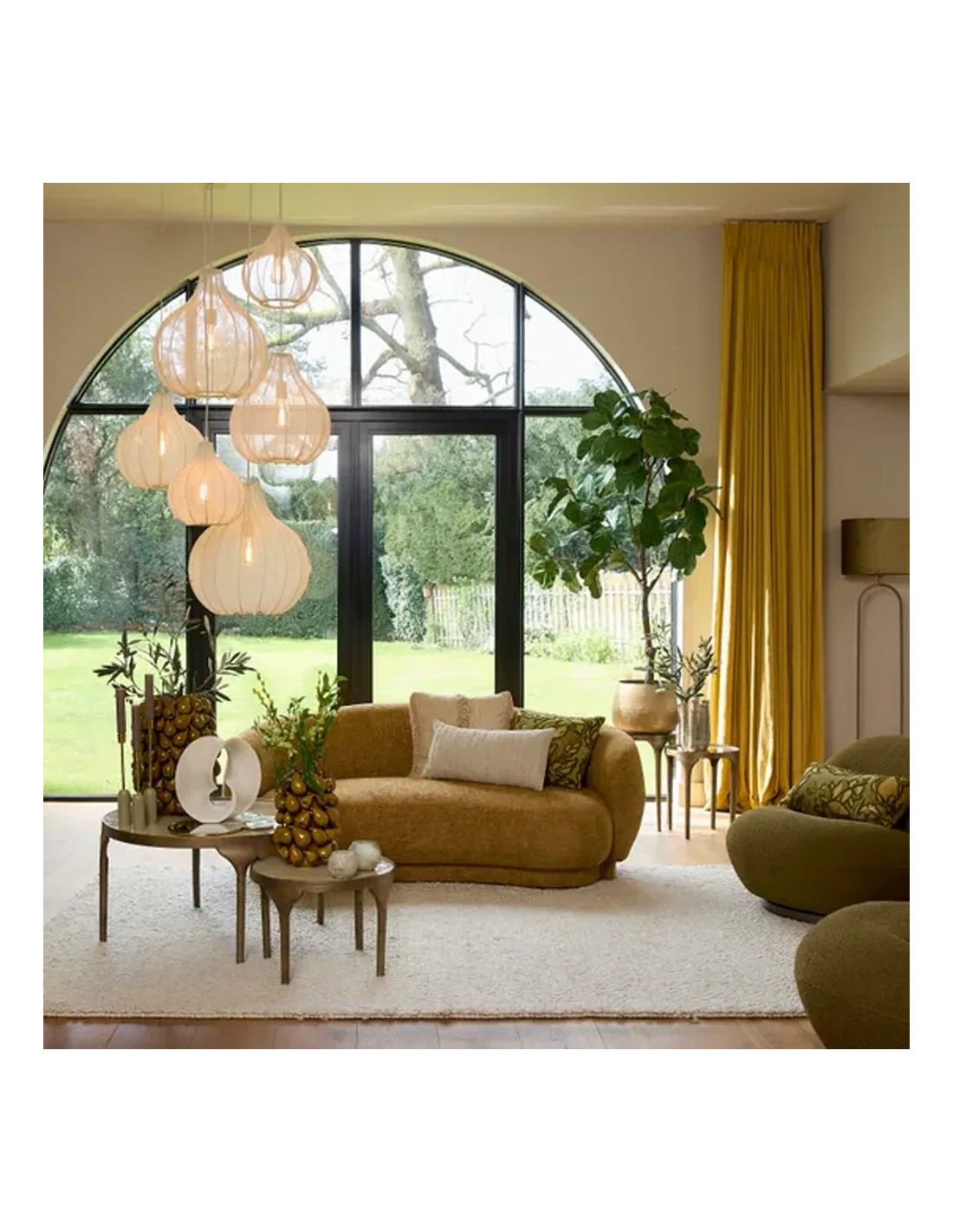 Esta lámpara de techo aporta una luz suave y envolvente gracias a su tul semi transparente en tono marfil. Su estética ligera y elegante la convierte en una pieza ideal para dormitorios, salones o recibidores con estilo sereno. Se recomienda el uso de bombilla LED con casquillo E27 (rosca grande), que garantiza eficiencia energética y una iluminación cálida y uniforme. Perfecta para ambientes que buscan equilibrio entre funcionalidad y belleza.