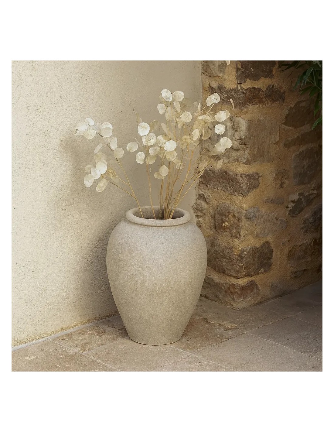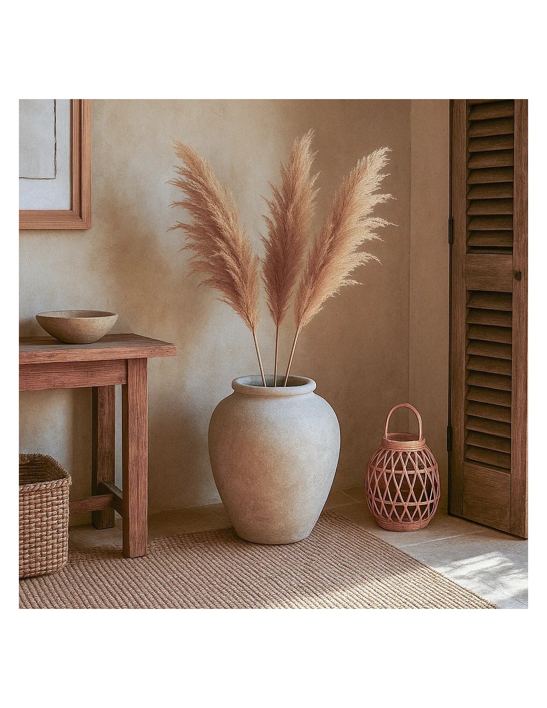 Macetero decorativo de cerámica en tono marrón, con forma generosa y acabado artesanal. Su estética cálida y sobria lo hace ideal para interiores mediterráneos, rústicos o contemporáneos. Aporta volumen y textura en suelos, terrazas o espacios amplios.