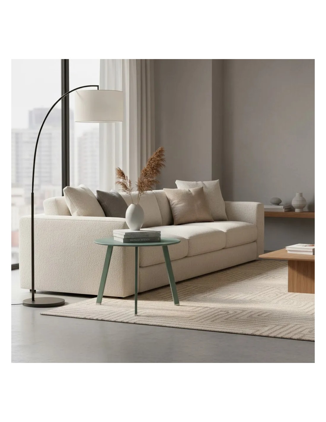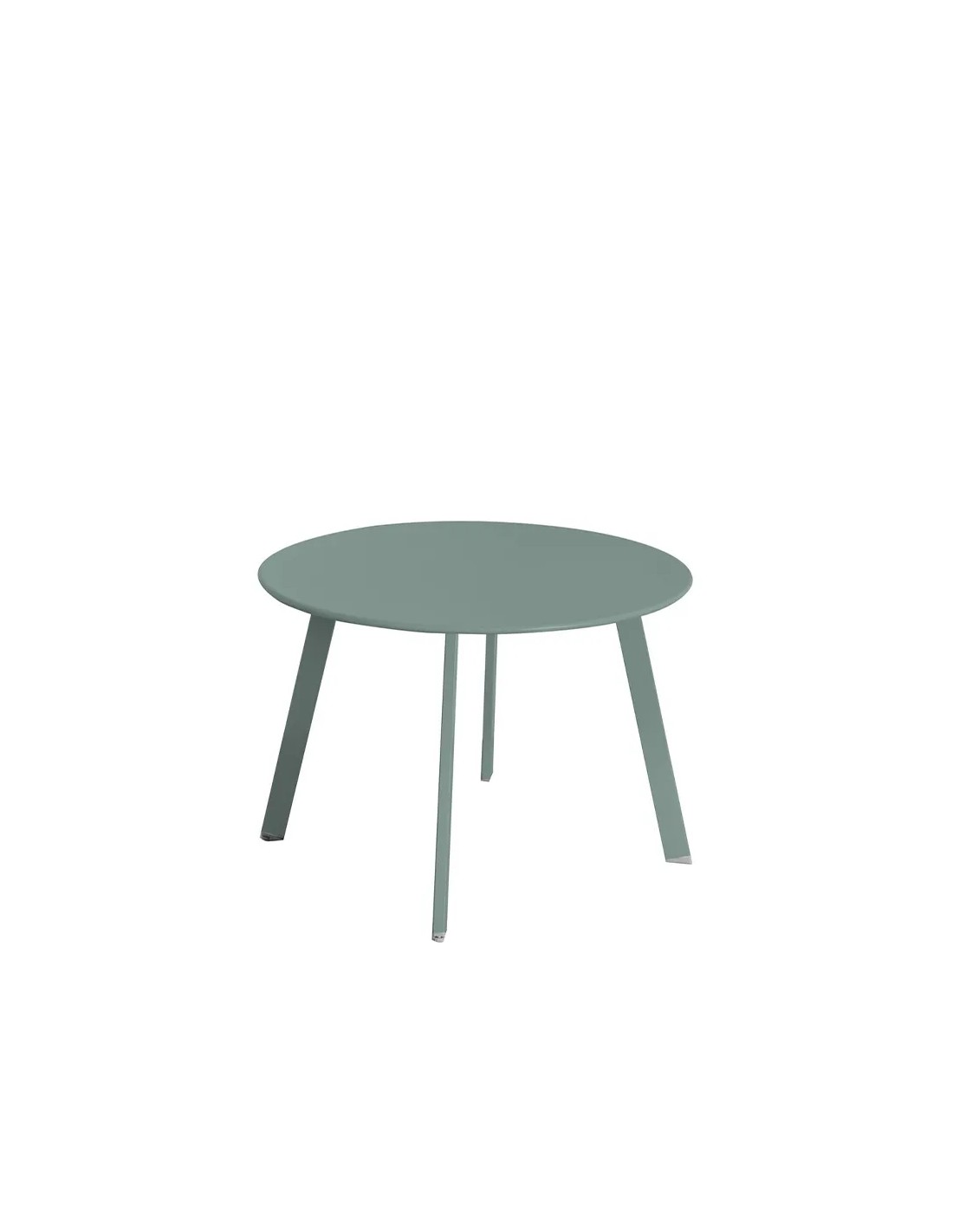 Mesa auxiliar de acero en tono gris, diseño redondo y ligero, ideal para uso interior o exterior, perfecta para combinar o usar como apoyo funcional.