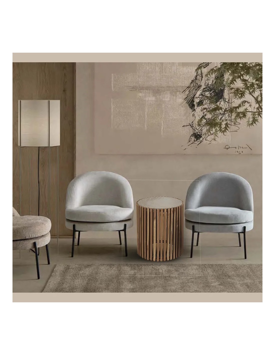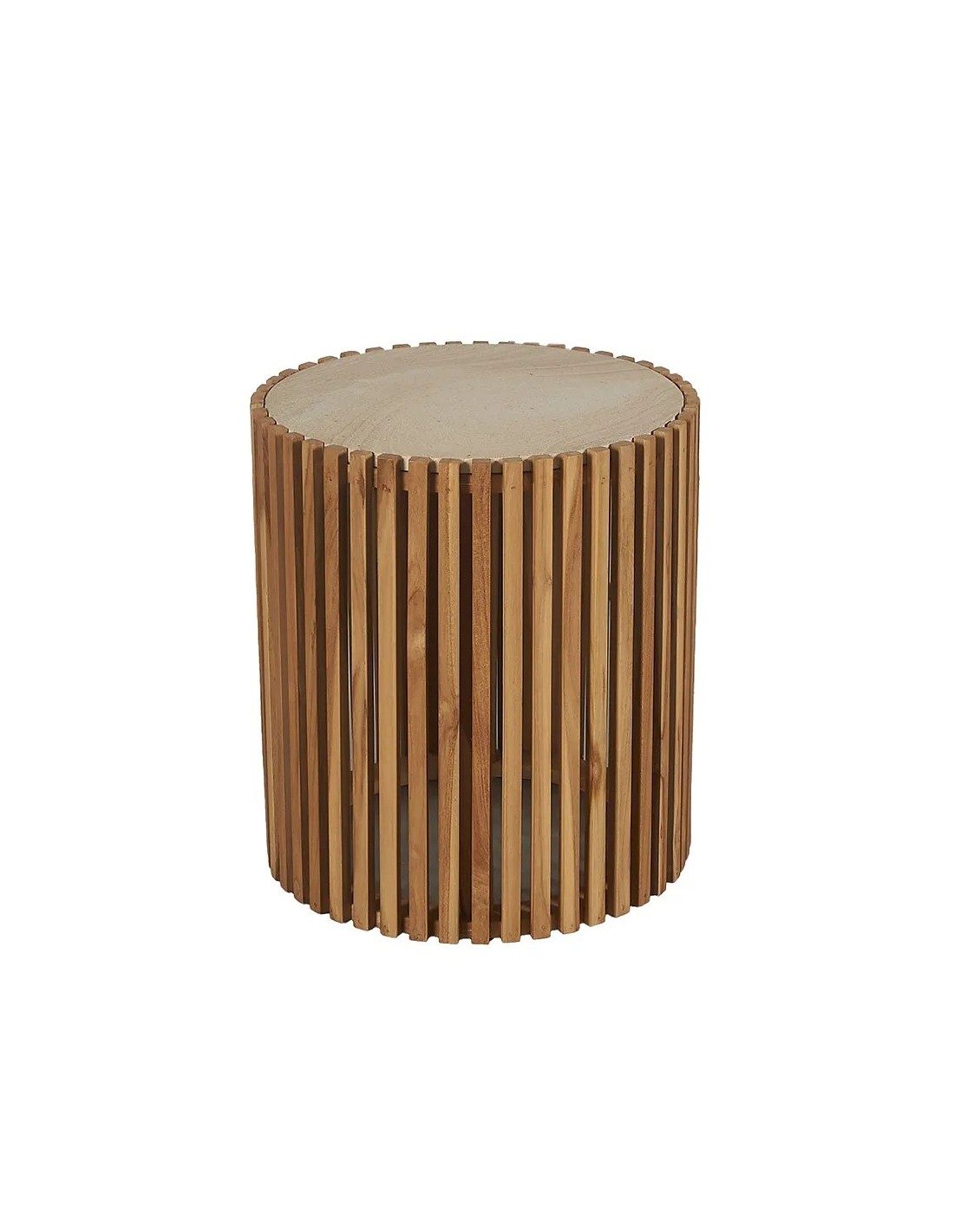 Mesa auxiliar de madera maciza alistonada con tapa de mármol natural, una pieza elegante que aporta distinción a cualquier rincón.