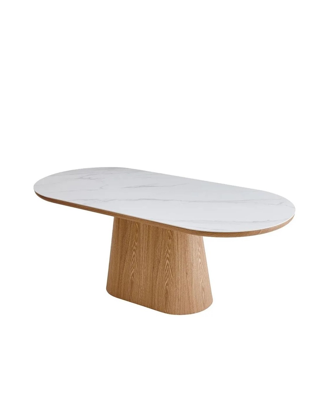 Mesa de comedor ovalada de 200x90x76 cm con sobre porcelánico y pata central de madera en acabado roble. Elegancia contemporánea y funcionalidad en una sola pieza.
