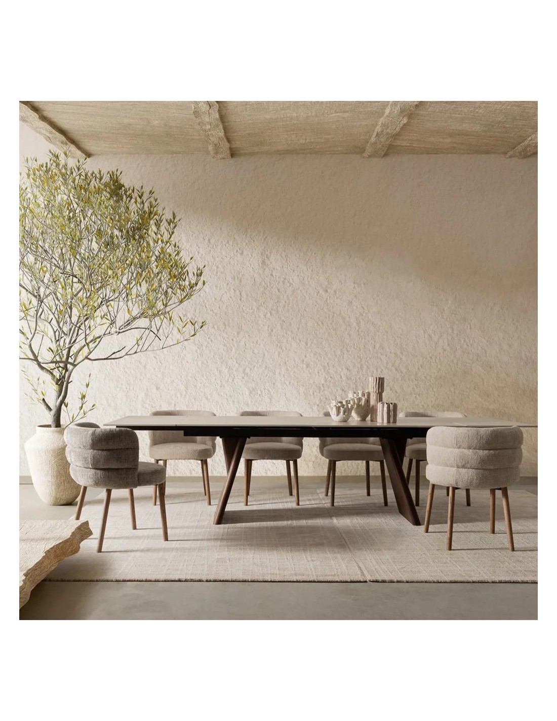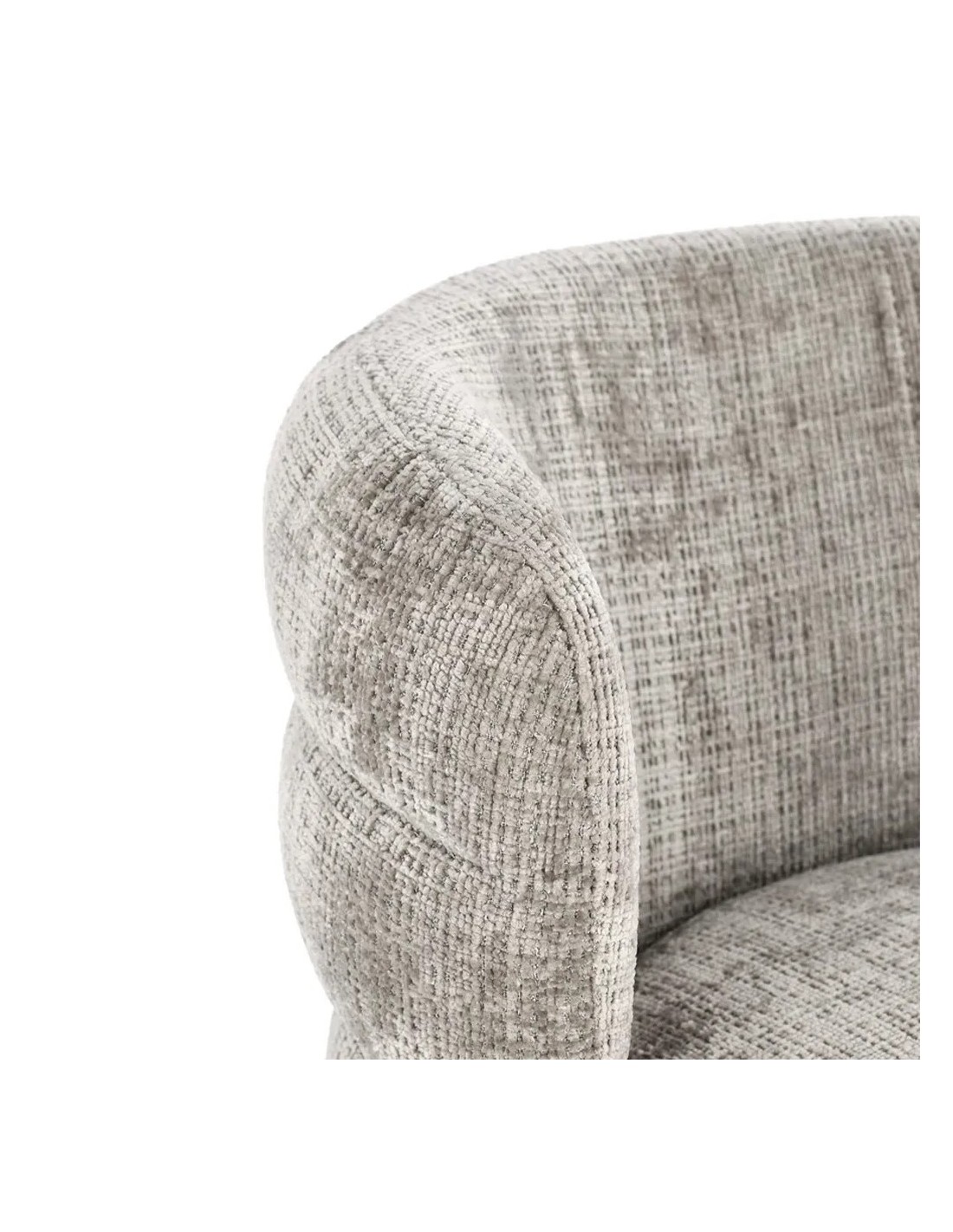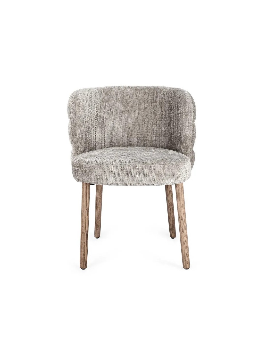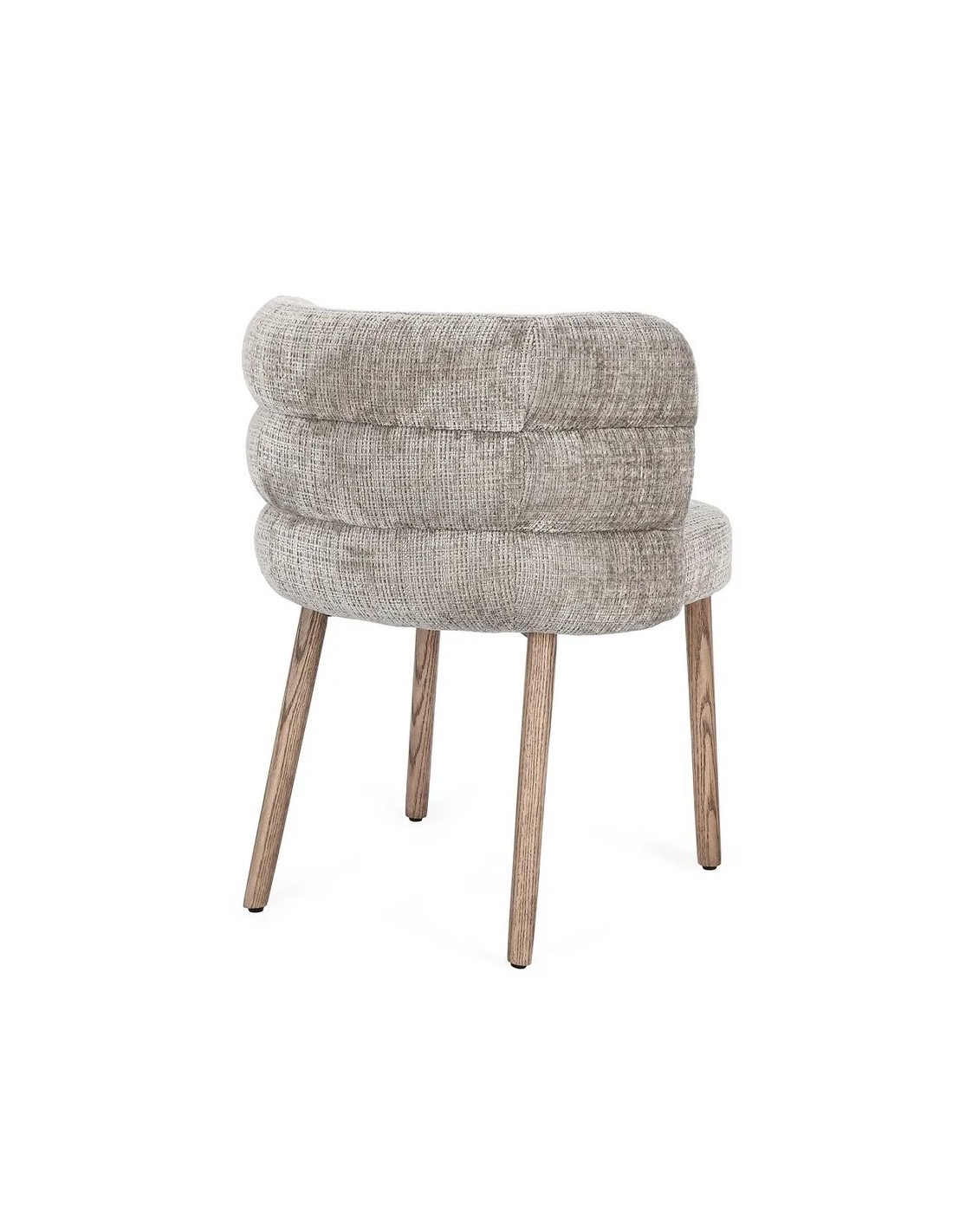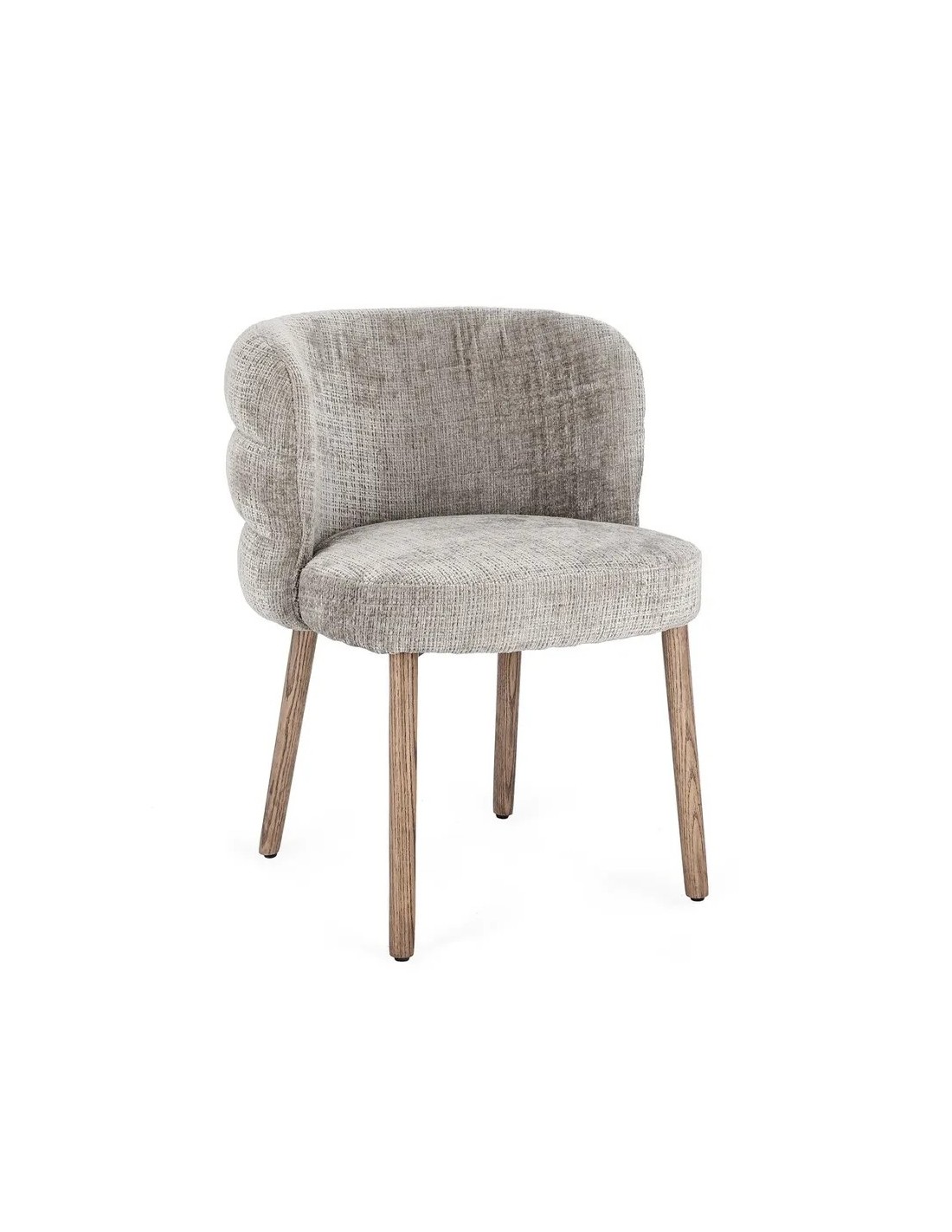 Silla tapizada en tejido tramado cruzado 100% poliéster, color gris piedra, con respaldo curvo y patas metálicas en acabado roble. Su diseño envolvente y proporciones generosas ofrecen confort y presencia visual en comedores, escritorios o espacios de reunión. La estructura combina ligereza y estabilidad, mientras que el tapizado aporta textura y sobriedad.