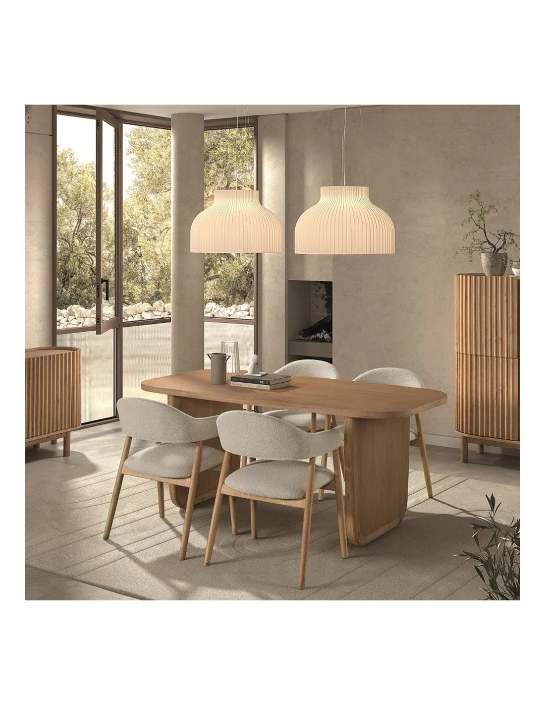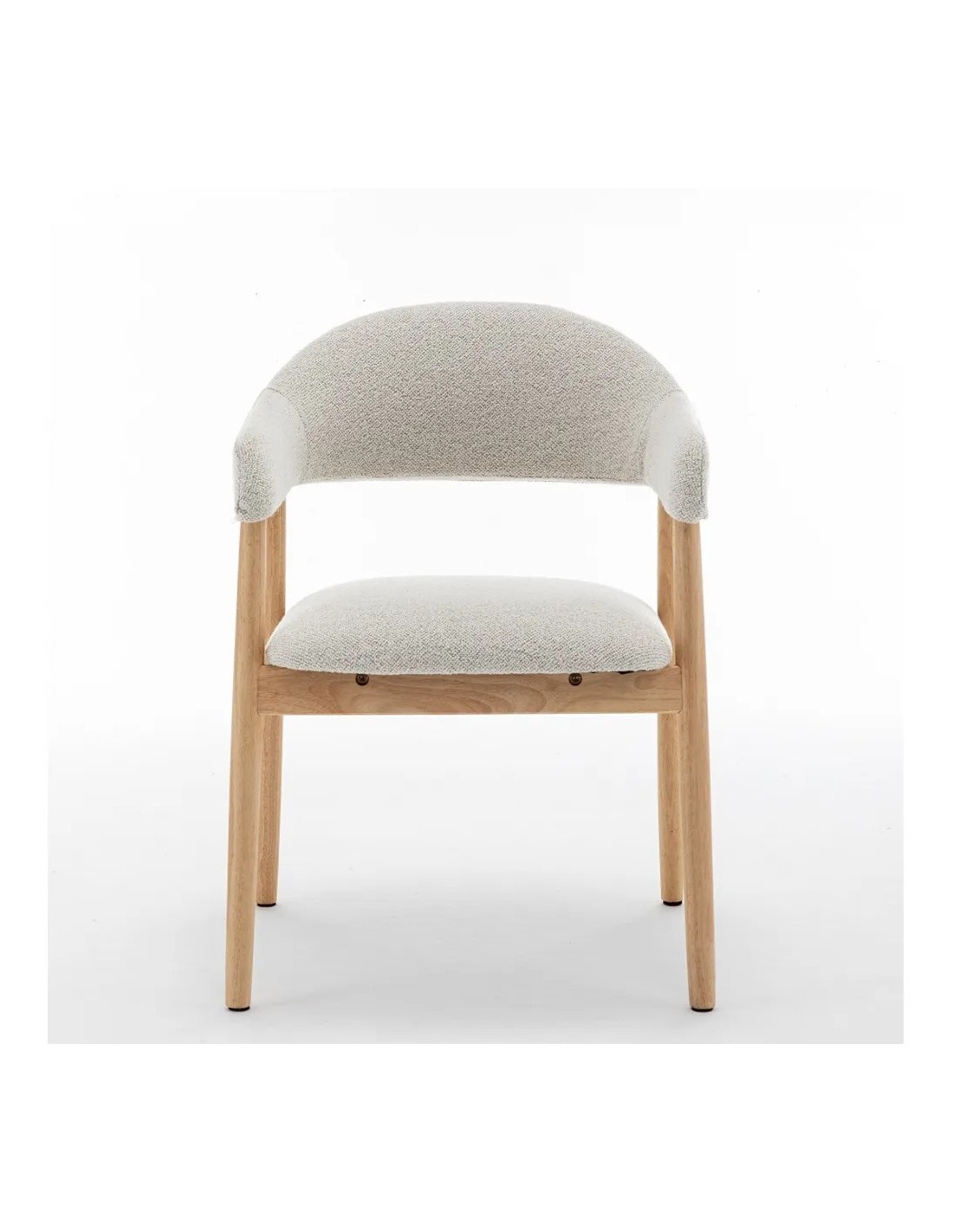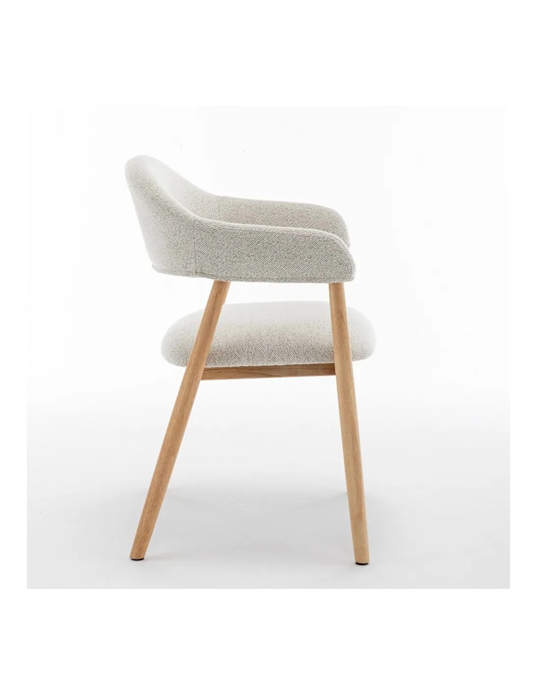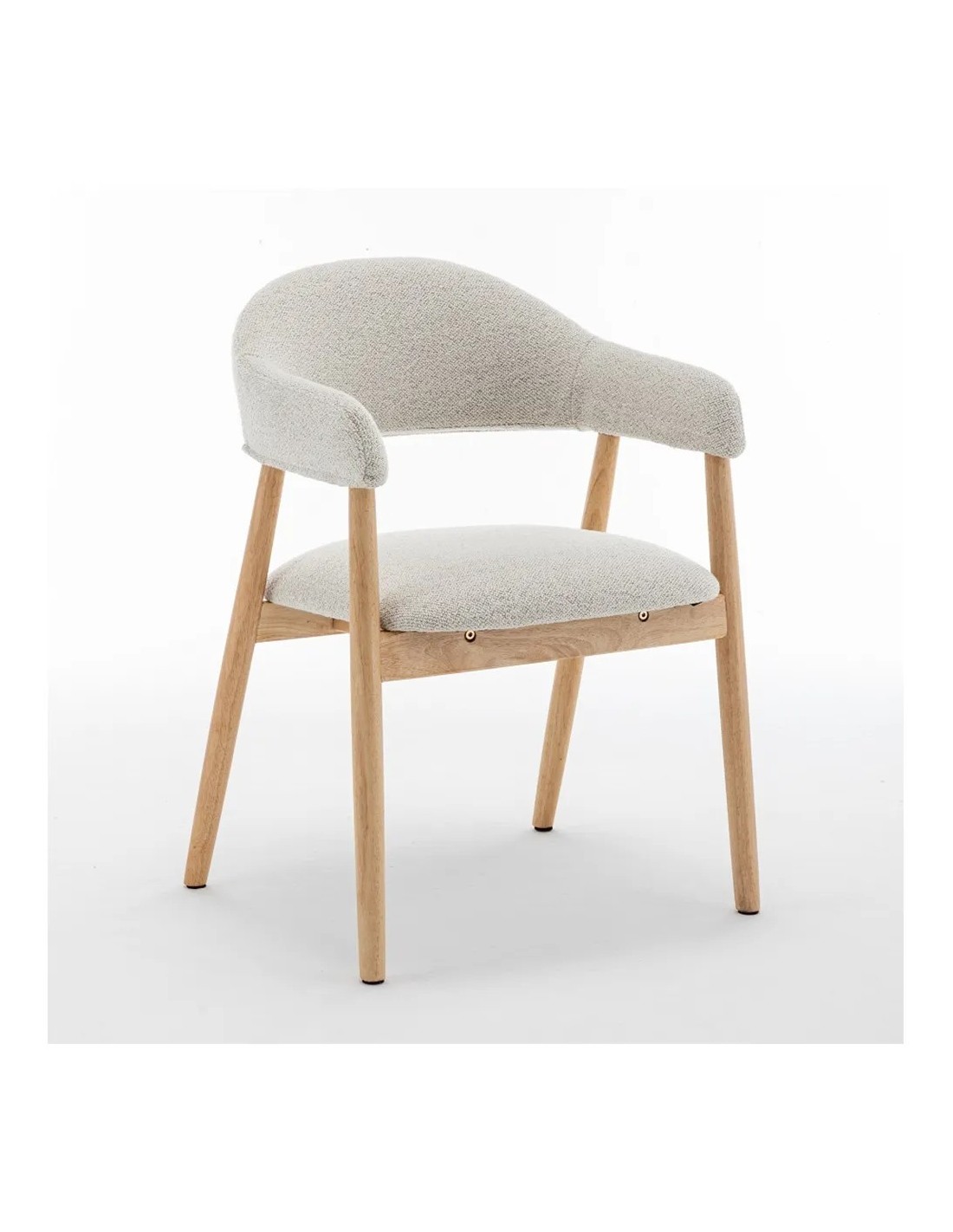 Silla tapizada en tela beige con patas de madera. Diseño cálido y versátil para interiores con estilo.