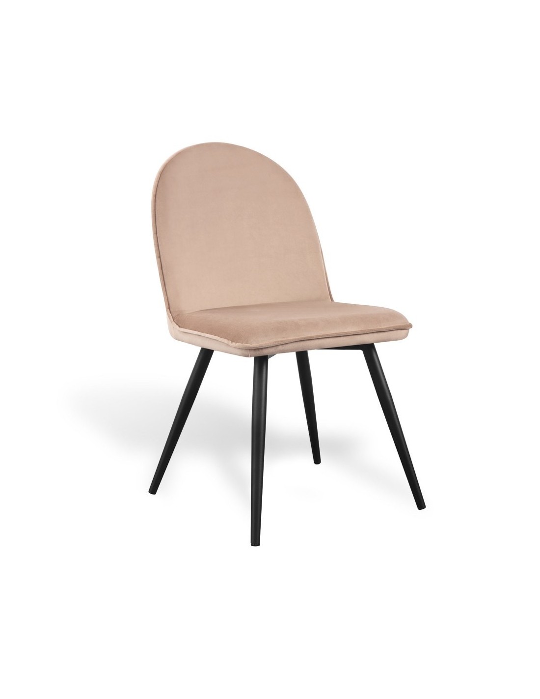 Silla tapizada en terciopelo color arena con patas metálicas negras. Elegancia suave con contraste moderno y diseño envolvente.