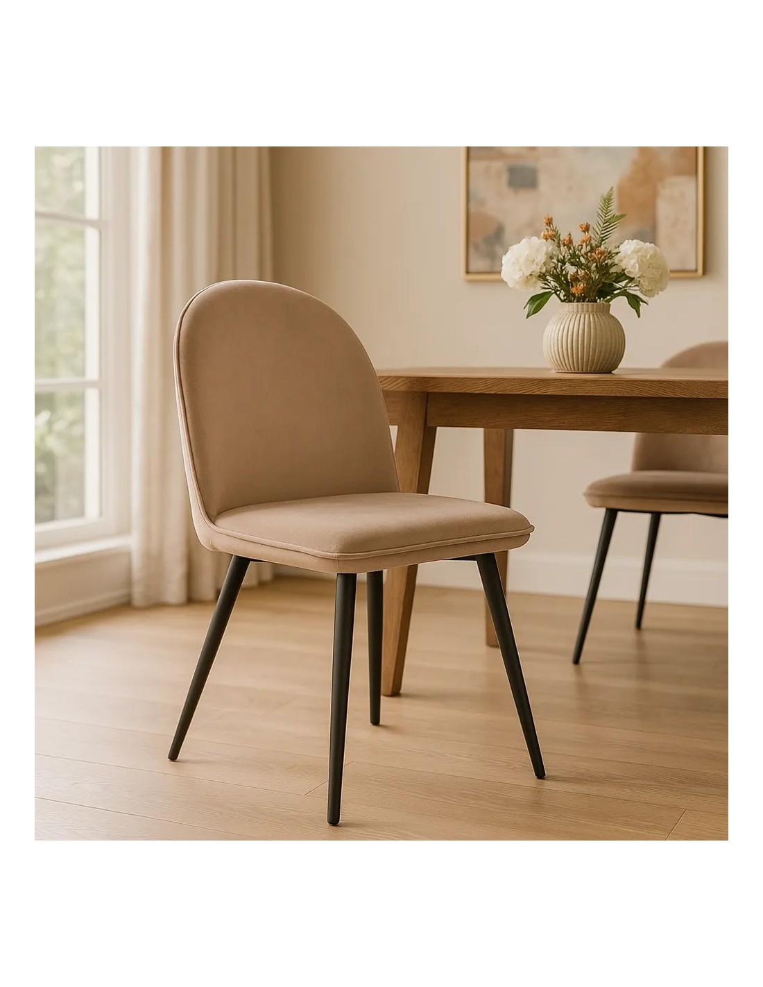 Esta silla combina la textura sedosa del terciopelo arena con la firmeza visual de sus patas metálicas negras, creando una pieza sofisticada y versátil. Su respaldo curvado y asiento acolchado ofrecen confort prolongado, ideal para comedores, escritorios o espacios de reunión. El contraste entre tonos neutros y estructura oscura aporta carácter sin perder armonía.