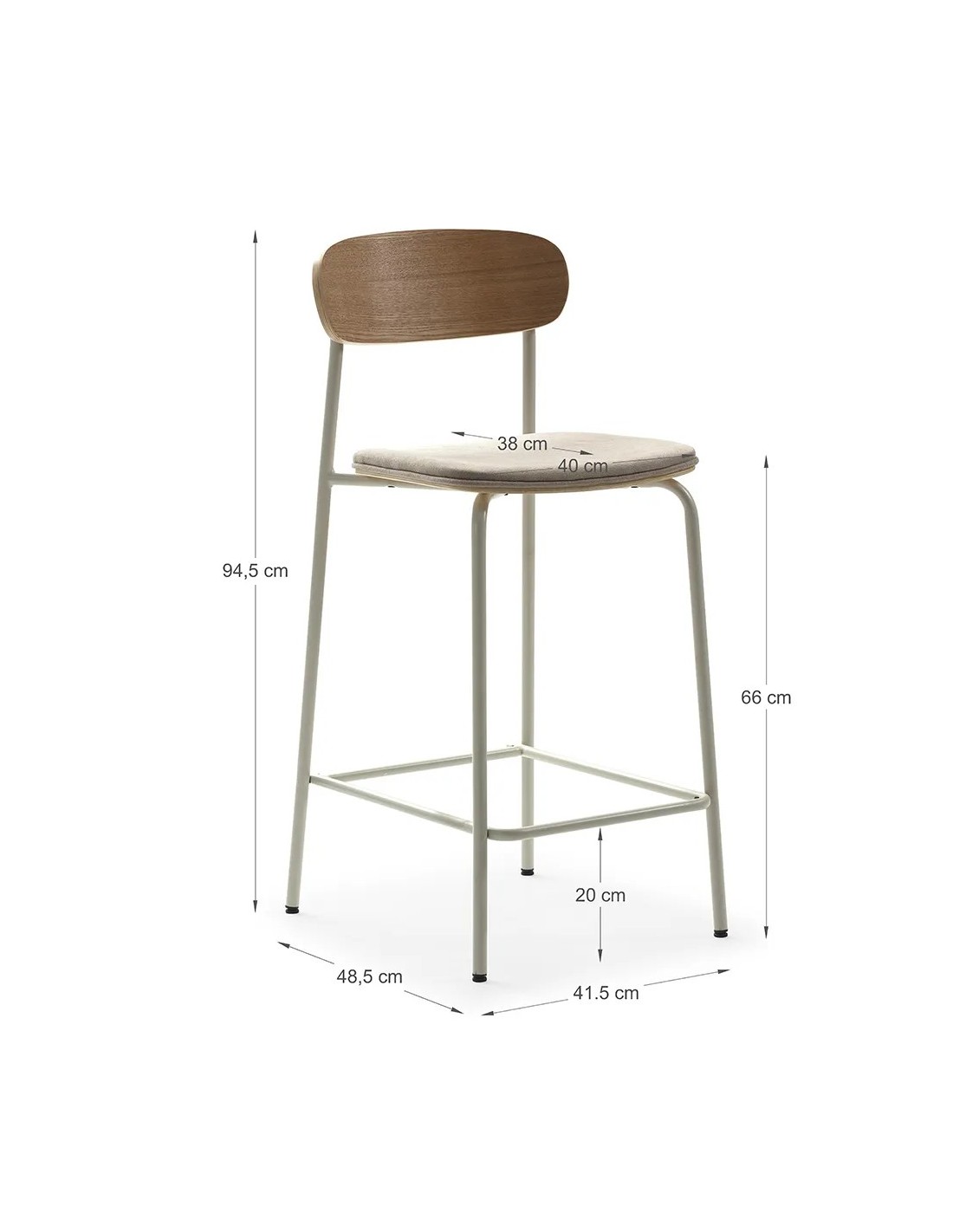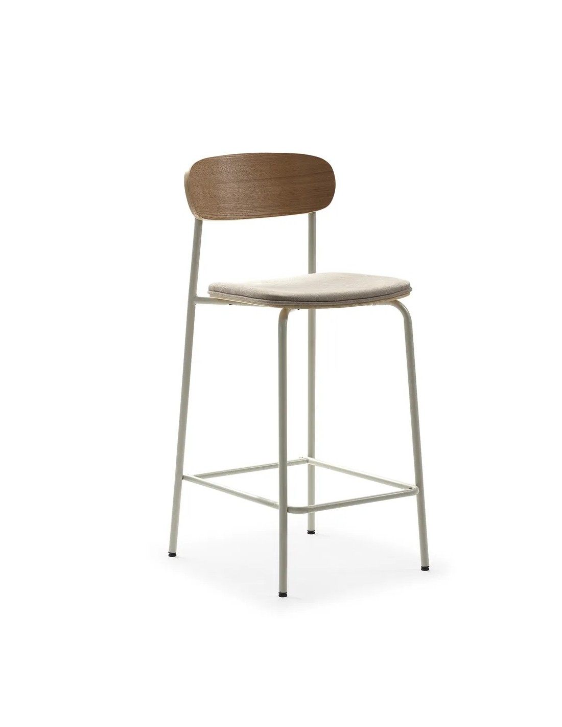 Taburete respaldo madera curvo, asiento tela patas metal, blanco