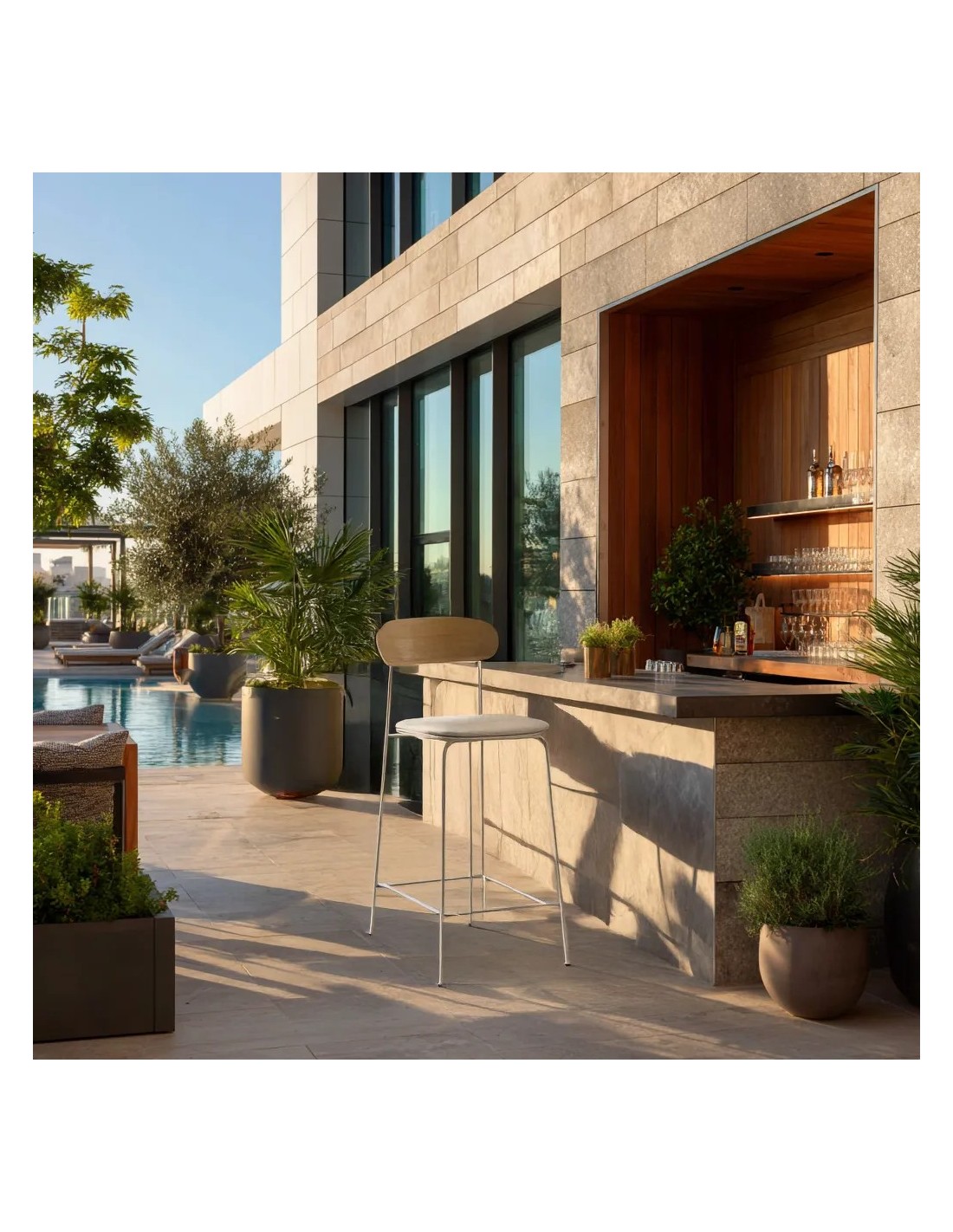 Taburete sillón beige con respaldo de madera y patas blancas. Elegancia y confort en un diseño moderno. Compra mínima 2 uds.
