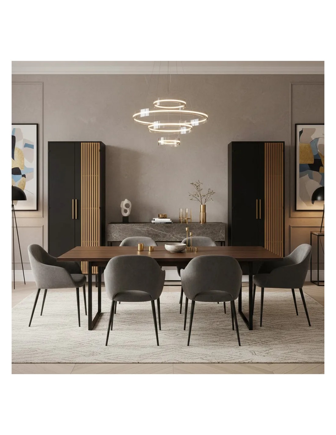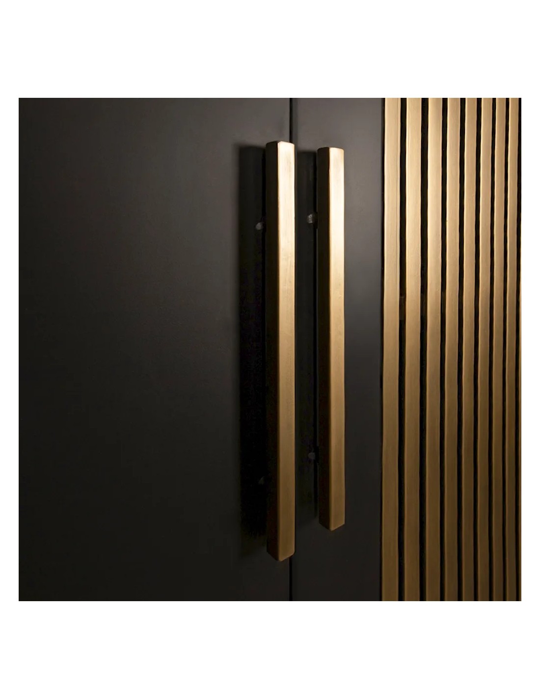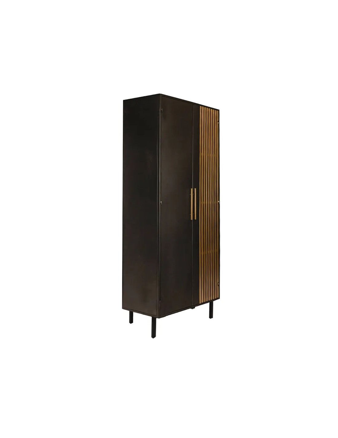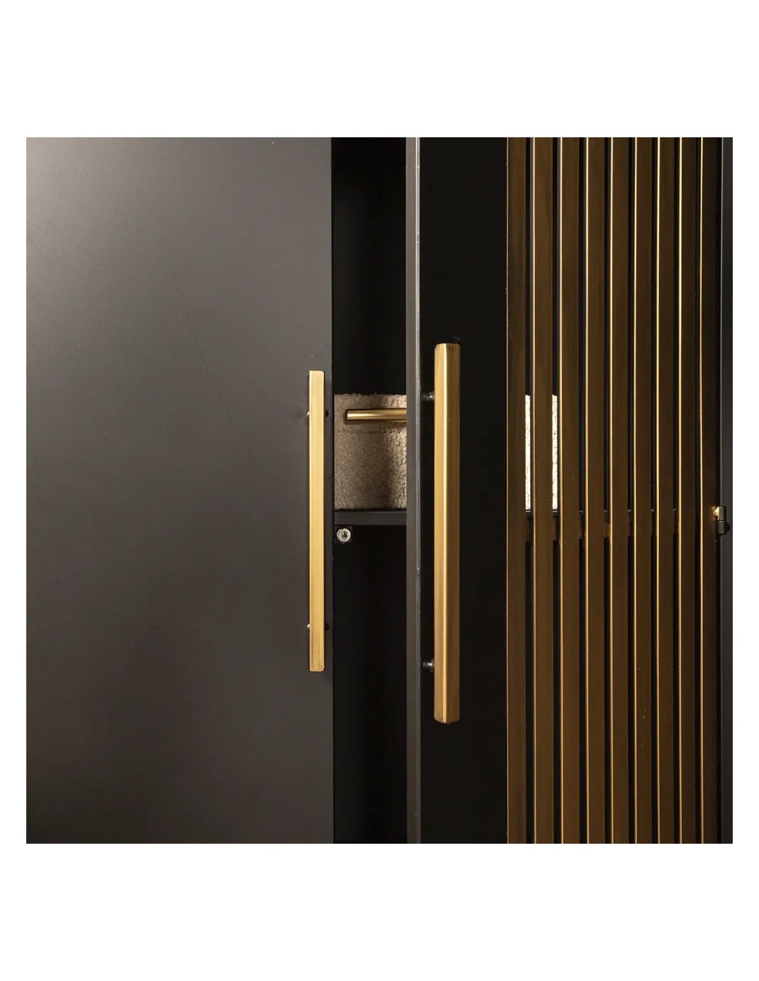 Armario de dos puertas en metal negro con detalle vertical dorado. Una pieza de carácter sofisticado para espacios de comedor con estilo contemporáneo.