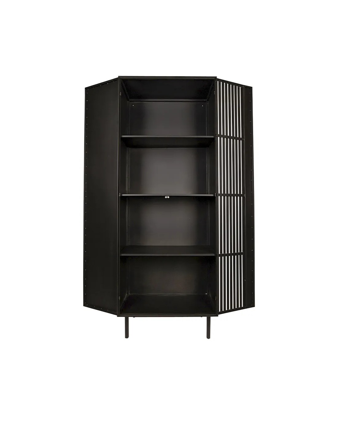 Este armario de metal negro destaca por su elegante contraste con el detalle dorado vertical, aportando profundidad y ritmo visual al espacio. Su diseño estilizado y elevado sobre patas lo convierte en una pieza ligera a la vista, pero con una fuerte presencia decorativa.