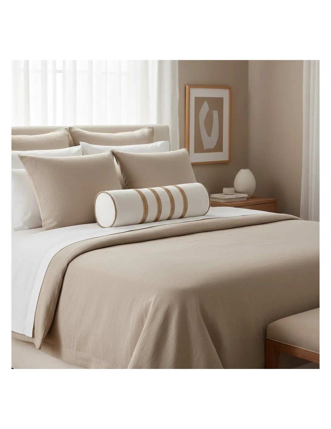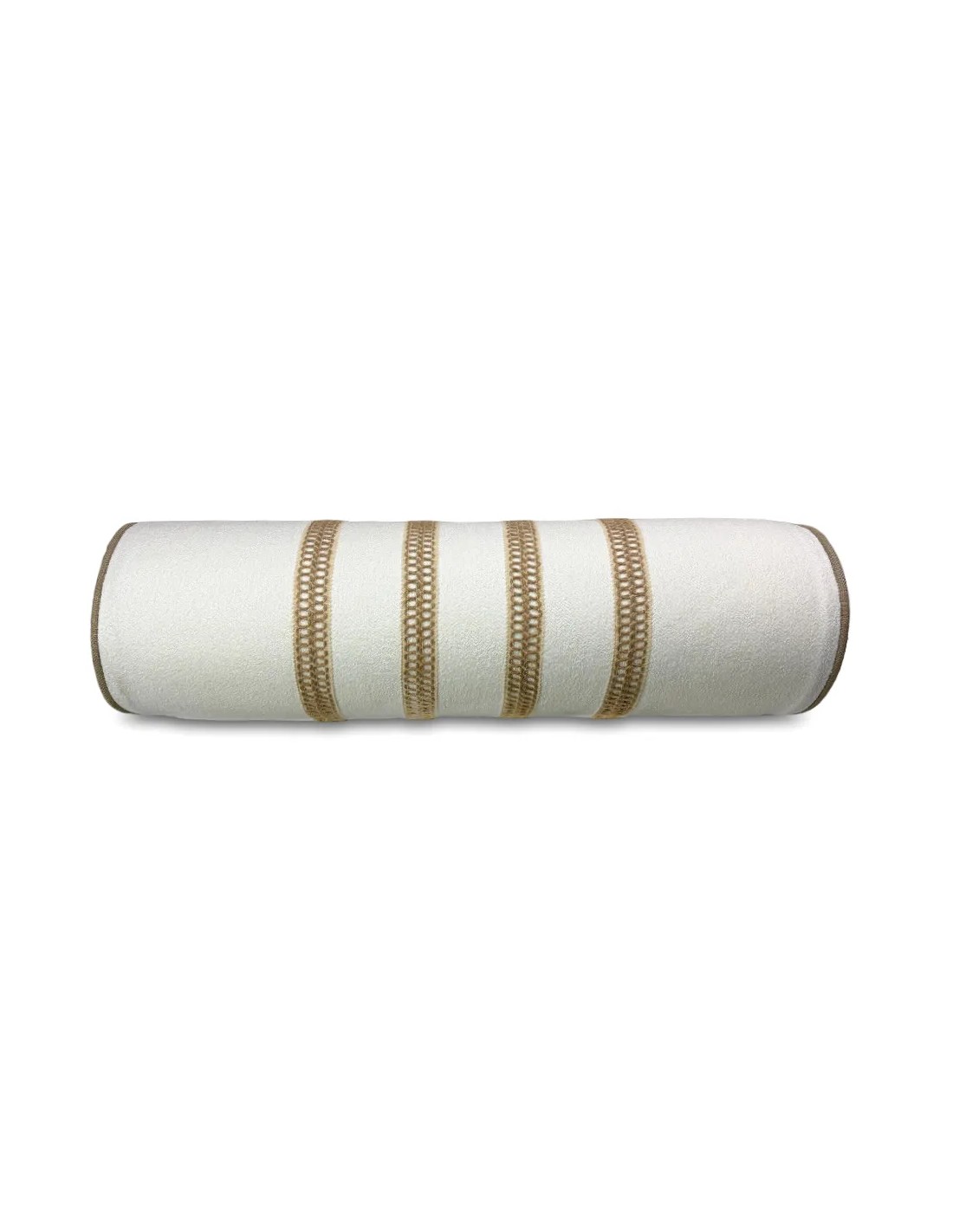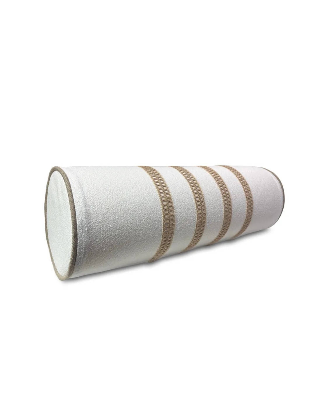 Ce coussin cylindrique allie une neutralité blanche avec des rayures de chameaux qui fournissent un rythme visuel et une chaleur. Sa forme ronde en fait un complément polyvalent pour les canapés ou les lits. Le remplissage de prime inclus garantit le confort, le volume et la durabilité, idéal pour soutenir, décorer ou embrasser.