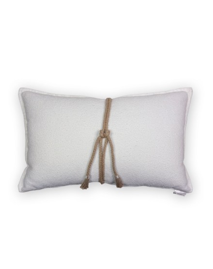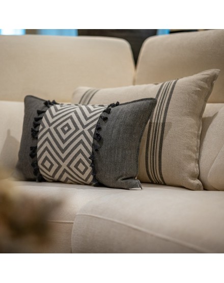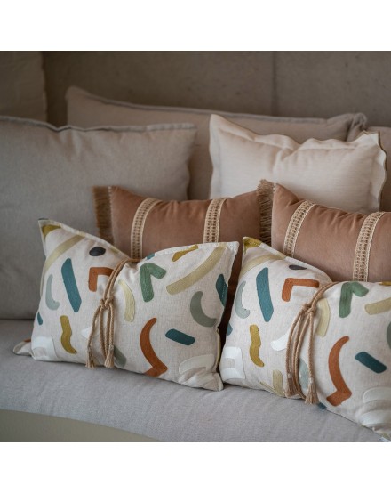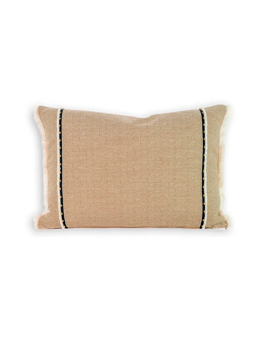 Cojín rectangular sofa cama geométrico camel relleno pluma fleco blanco 70x50
