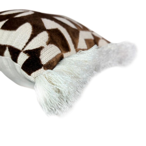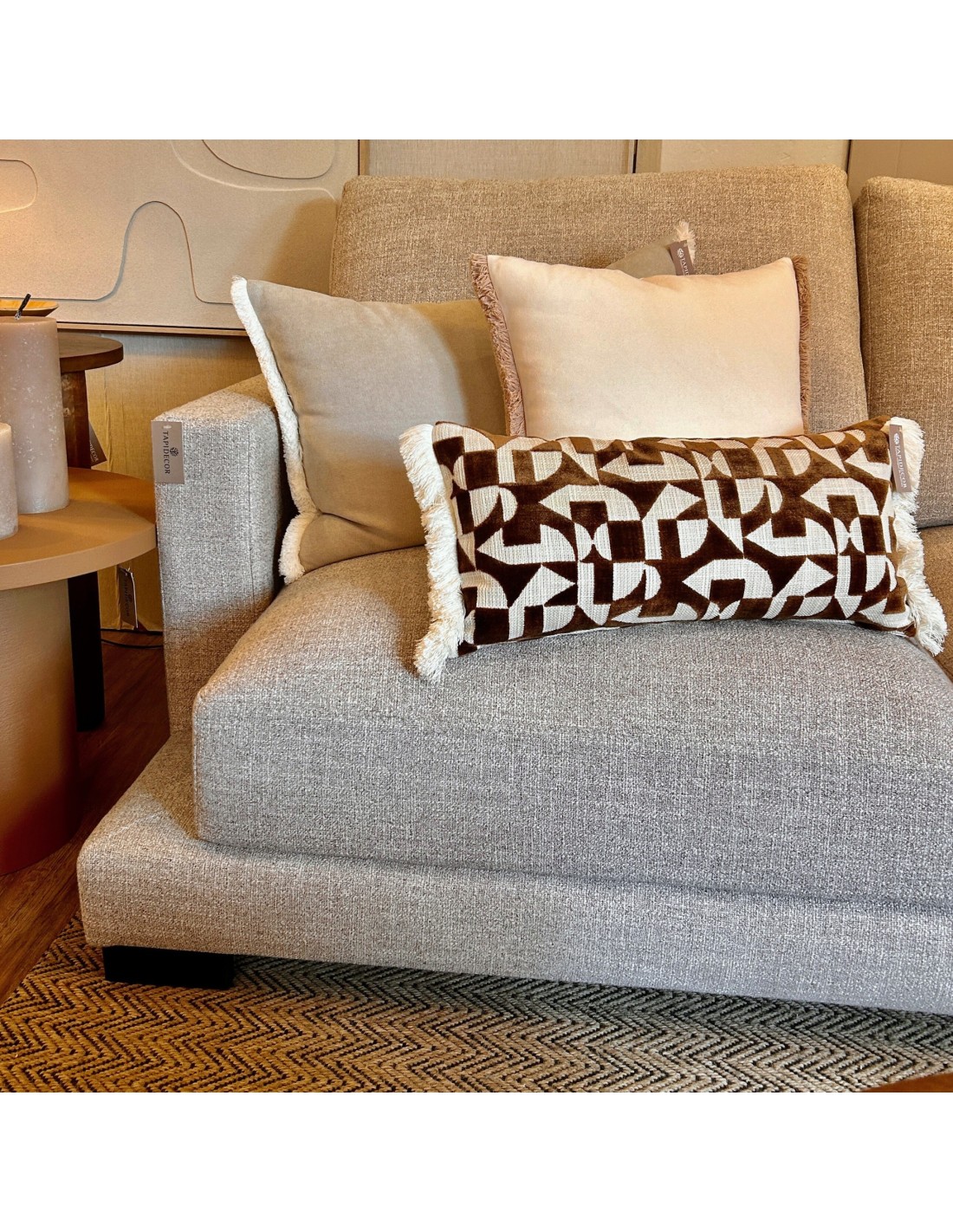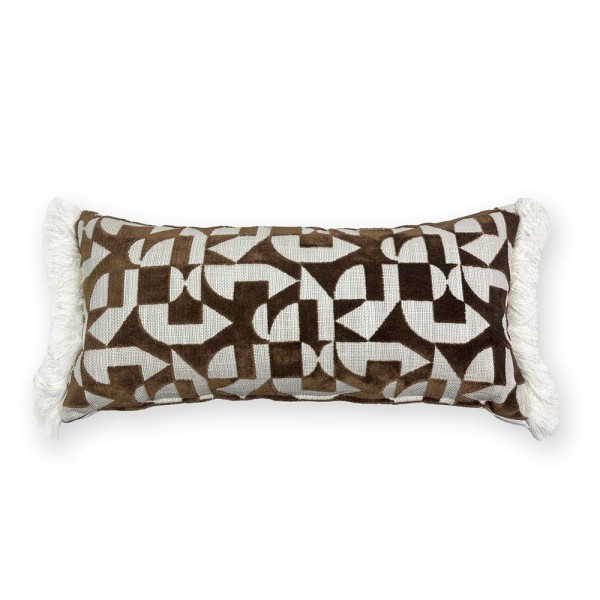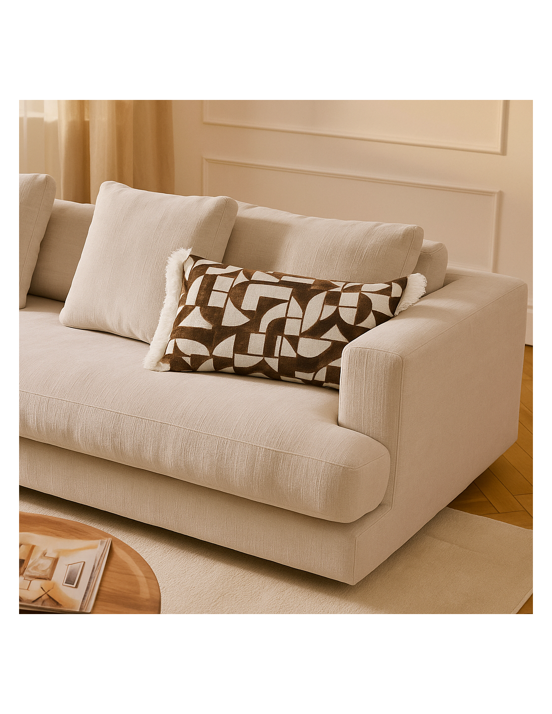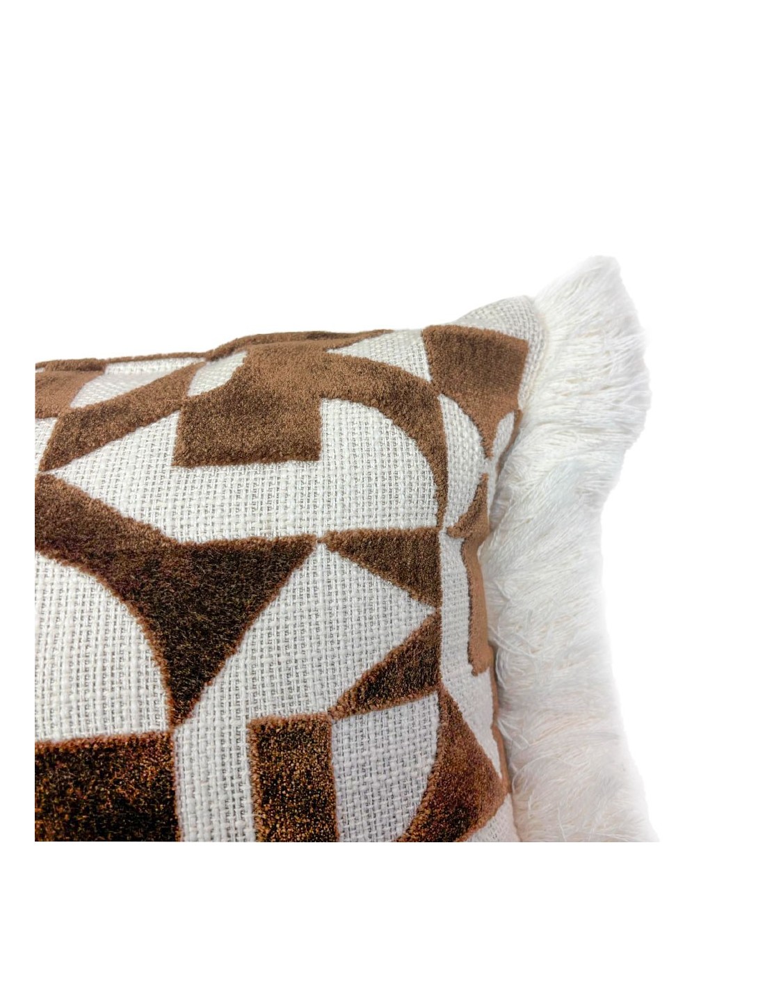 Cojín beige geométrico bronce fleco espum. 60X30 Relleno premium incluido