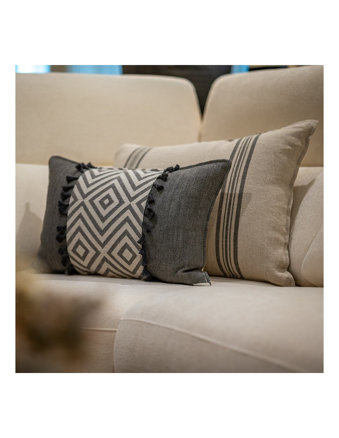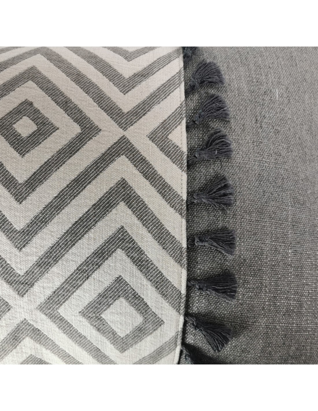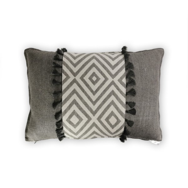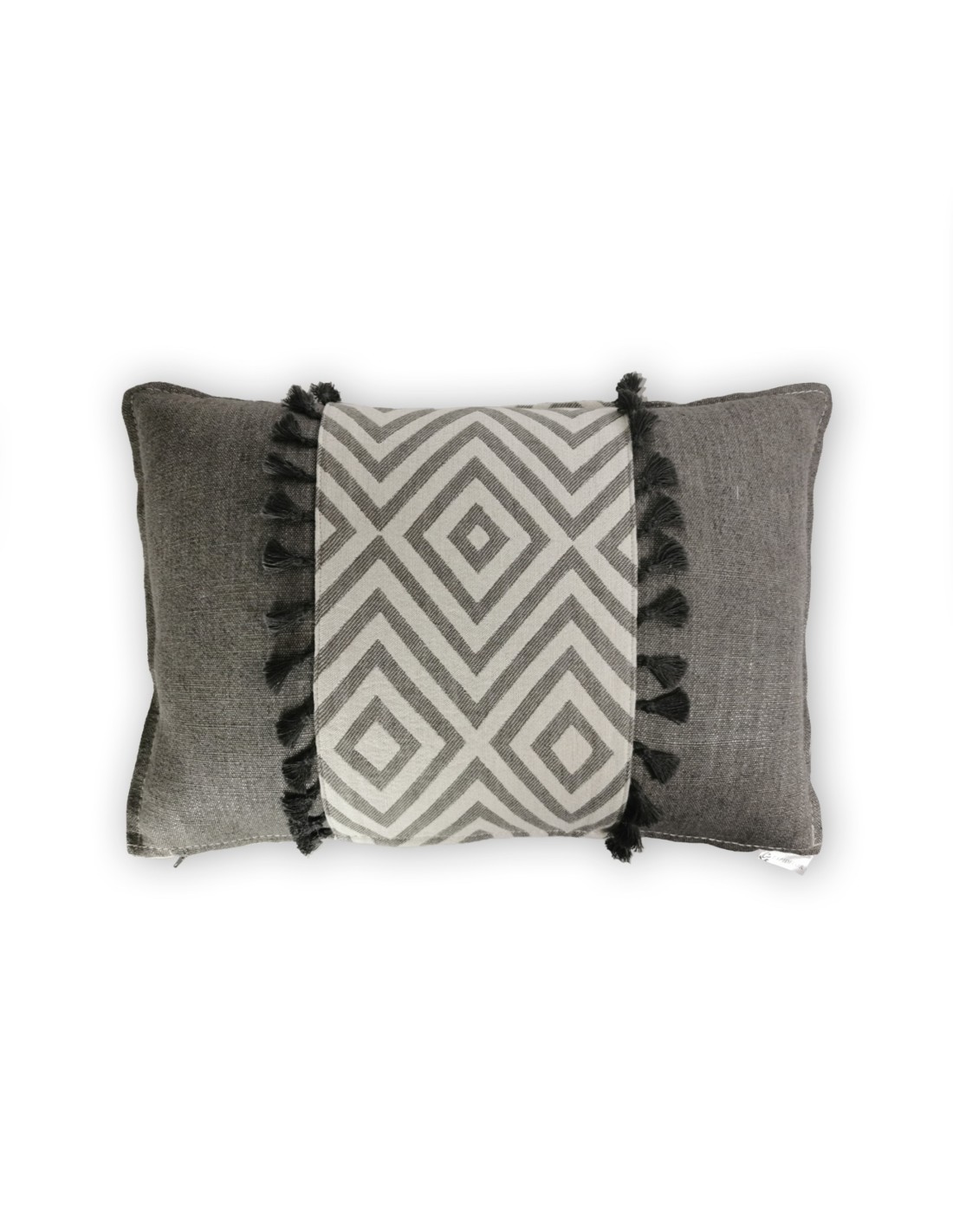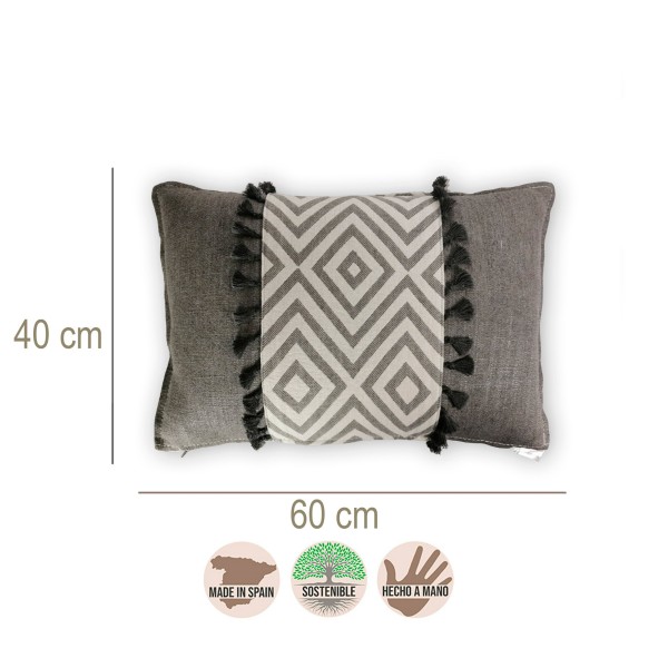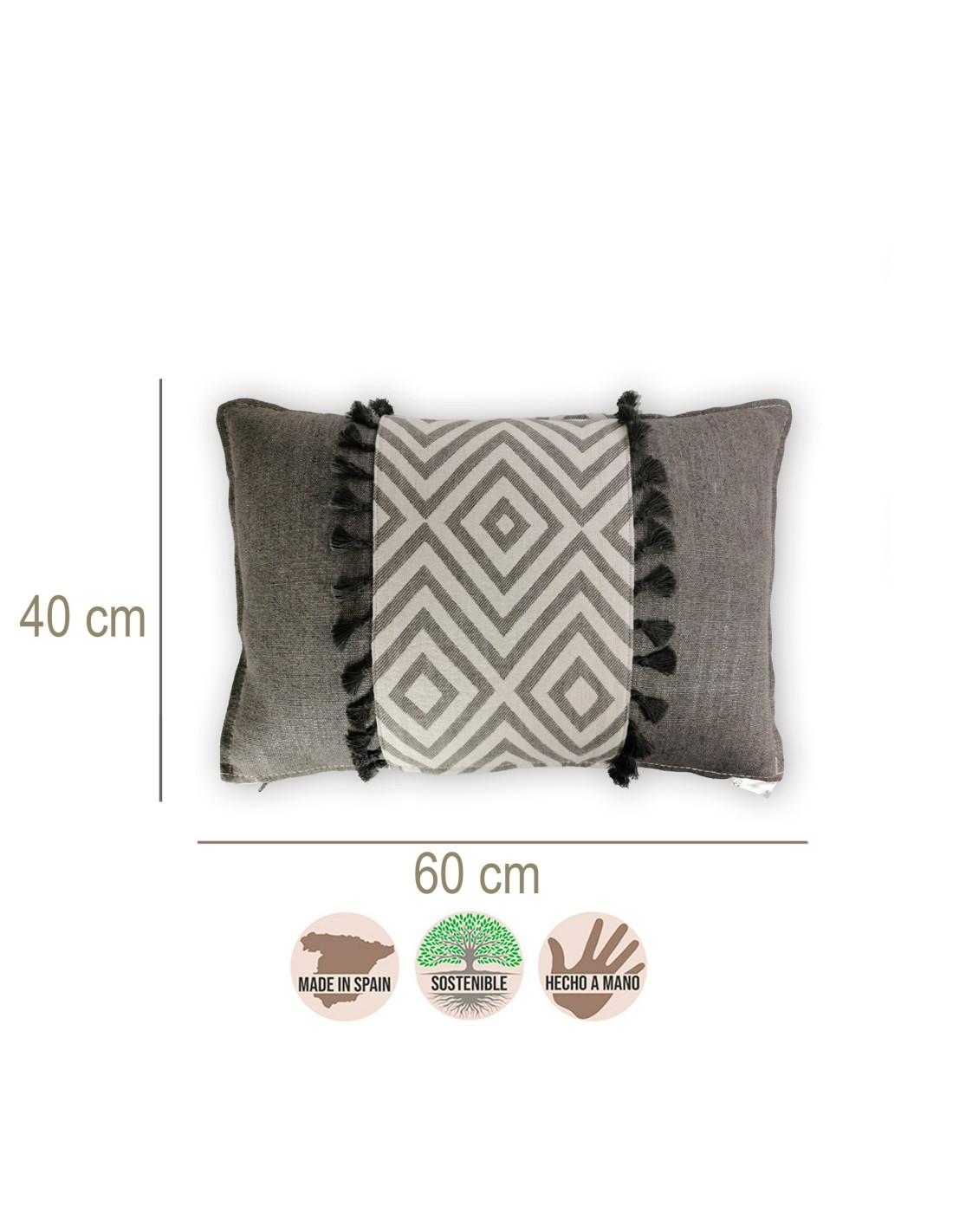 Cojín gris, banda central geométrico rombos fleco ponpon 60X40, Relleno premium incluido