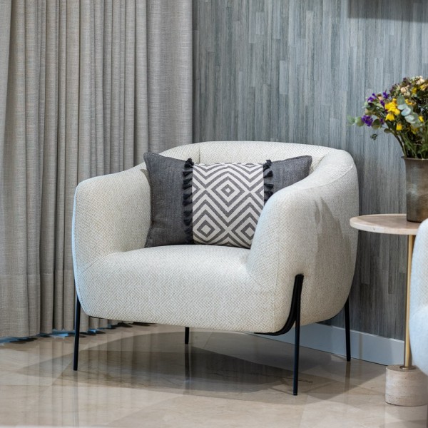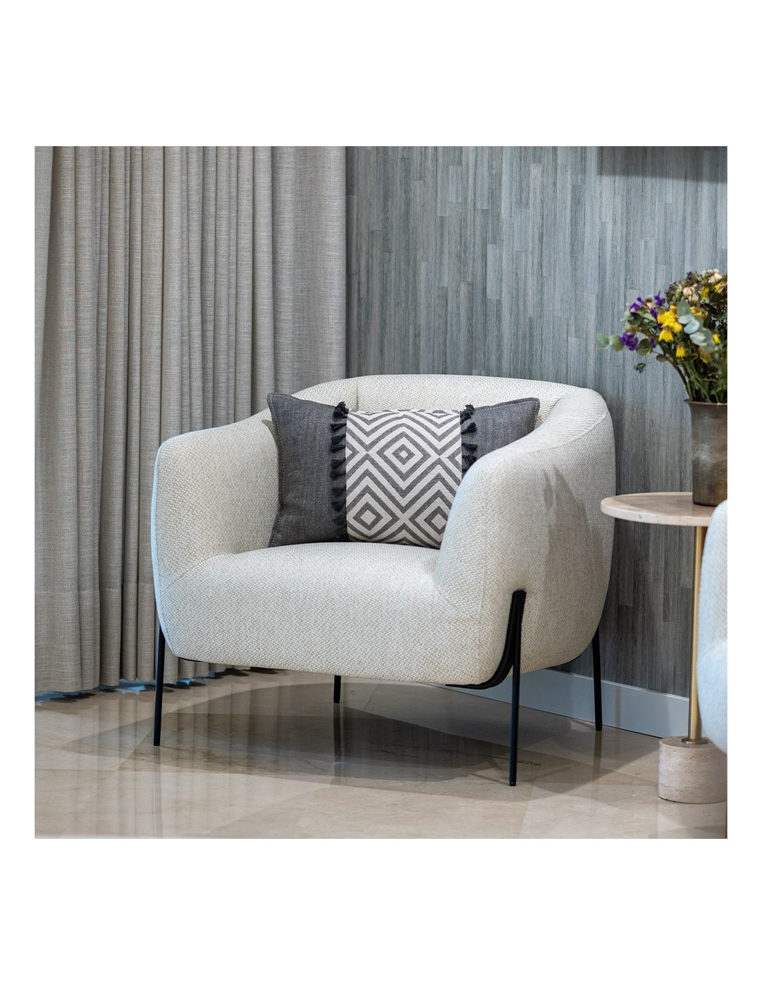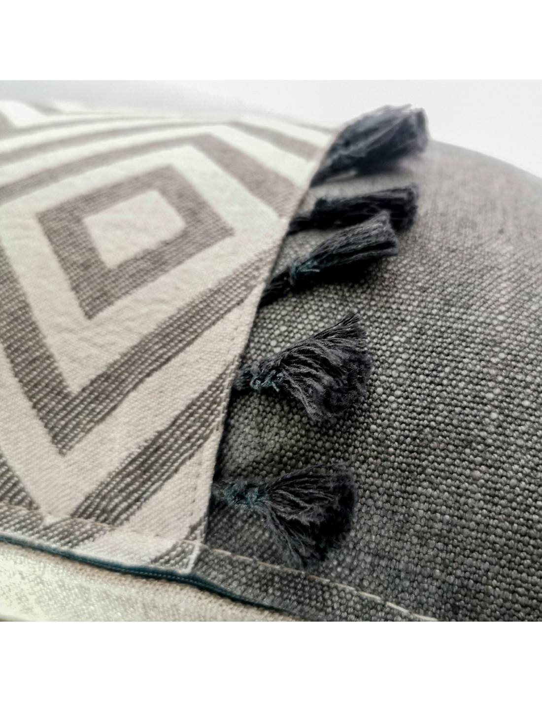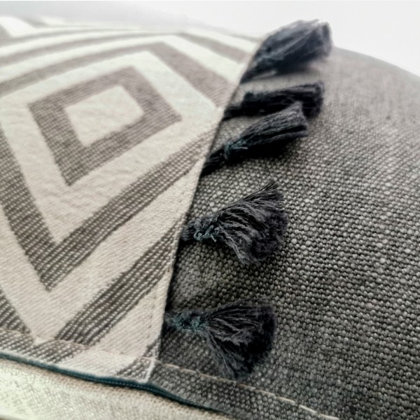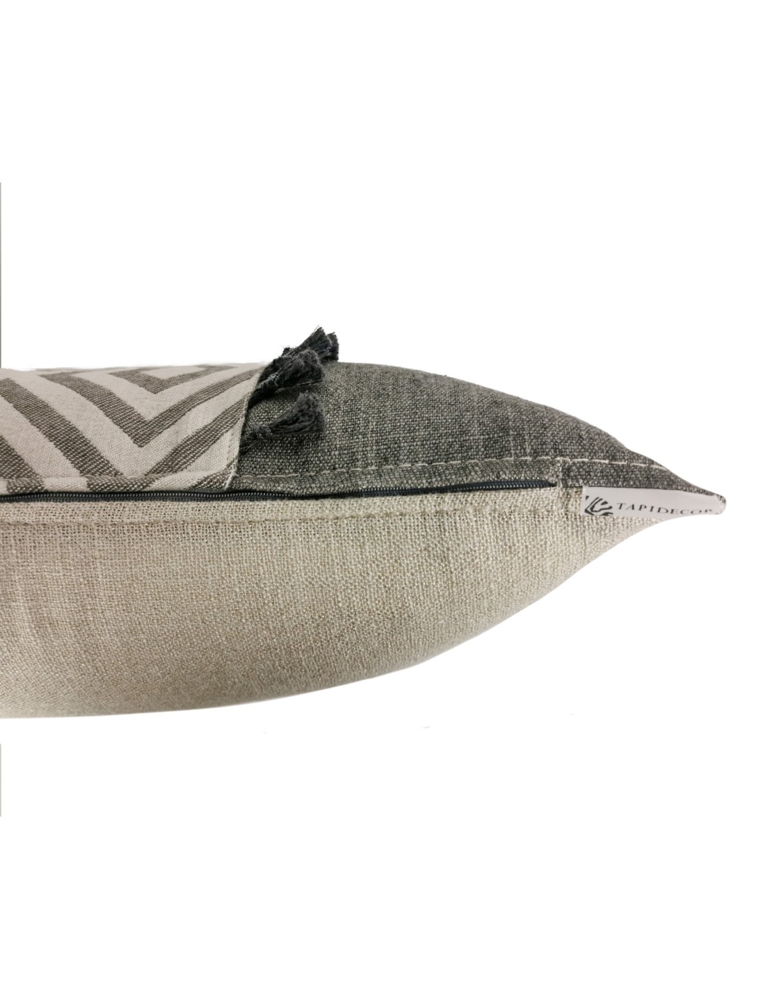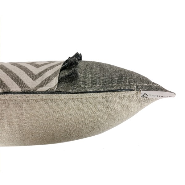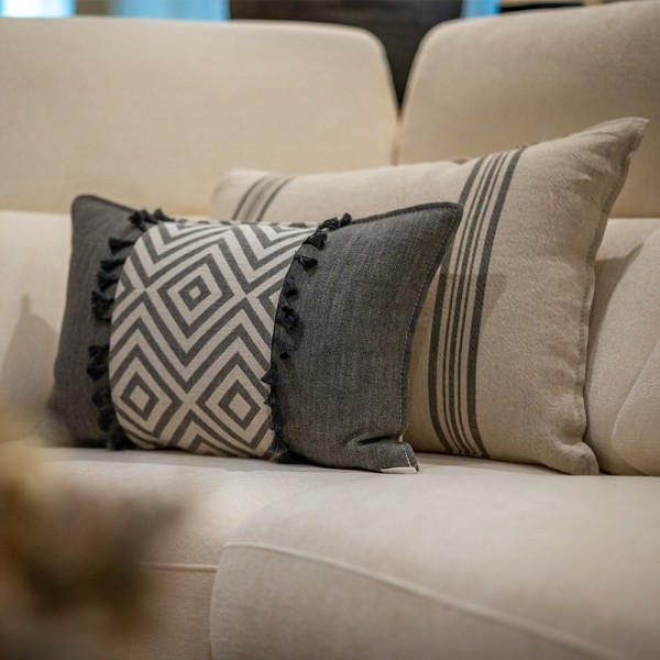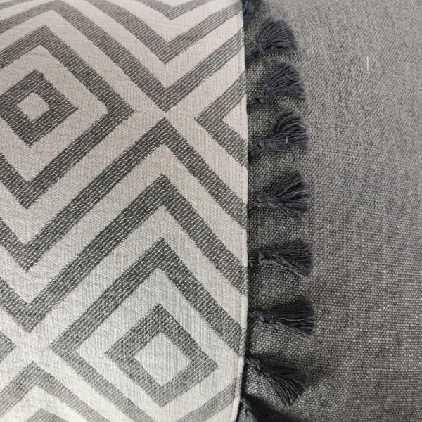 Cojín gris, banda central geométrico rombos fleco ponpon 60X40, Relleno premium incluido