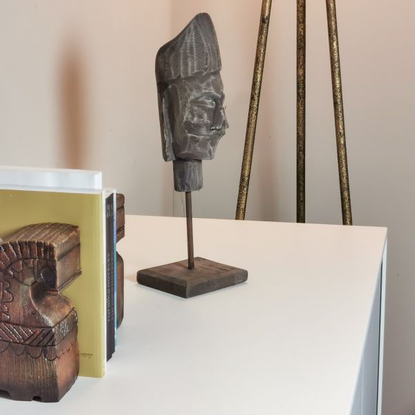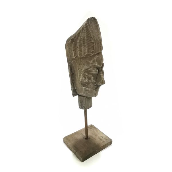 Figura escultura cara madera 11x10x36 gris oscura base madera