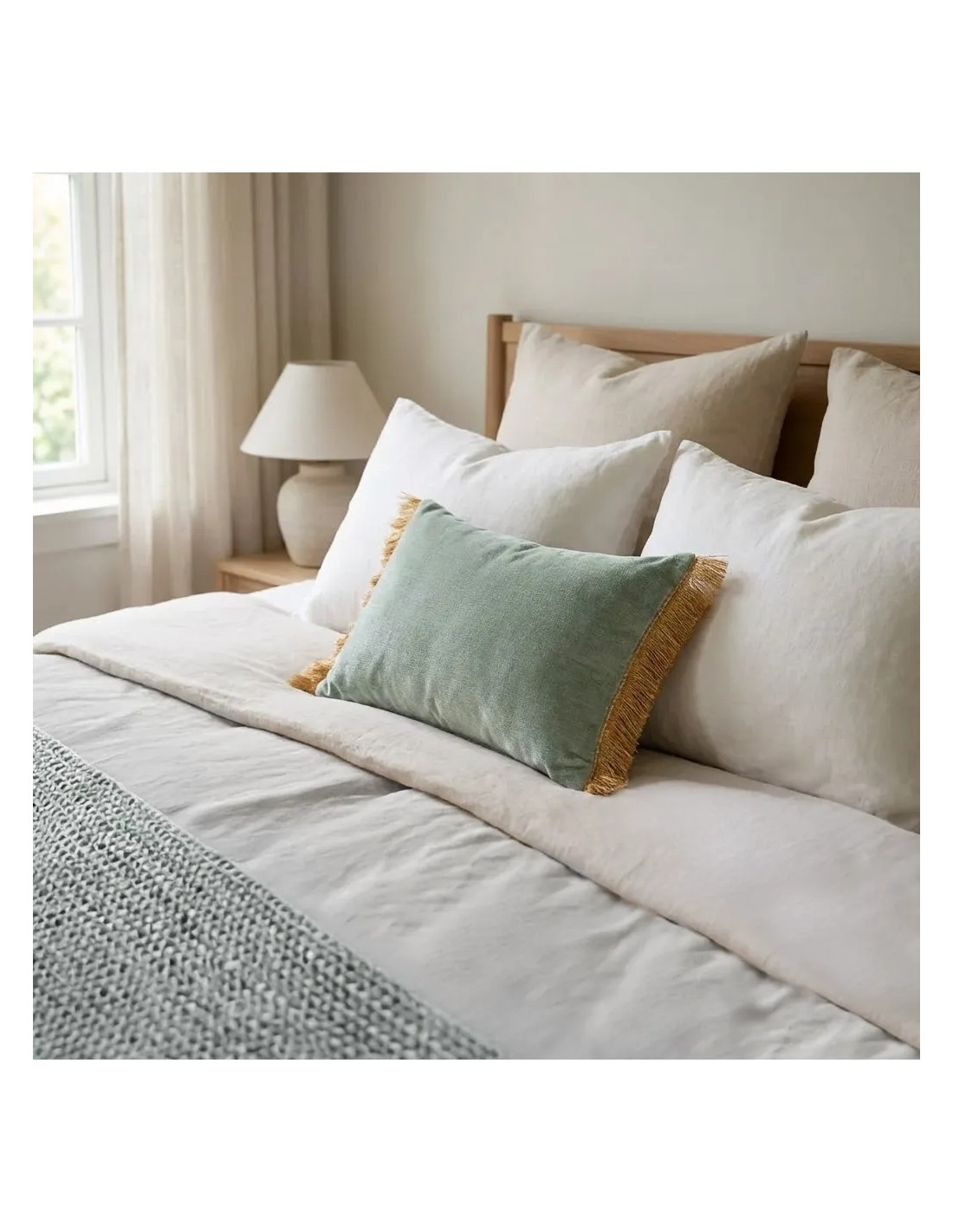 Cojín rectangular cama sofá liso verde agua relleno pluma fleco rafia 60x40