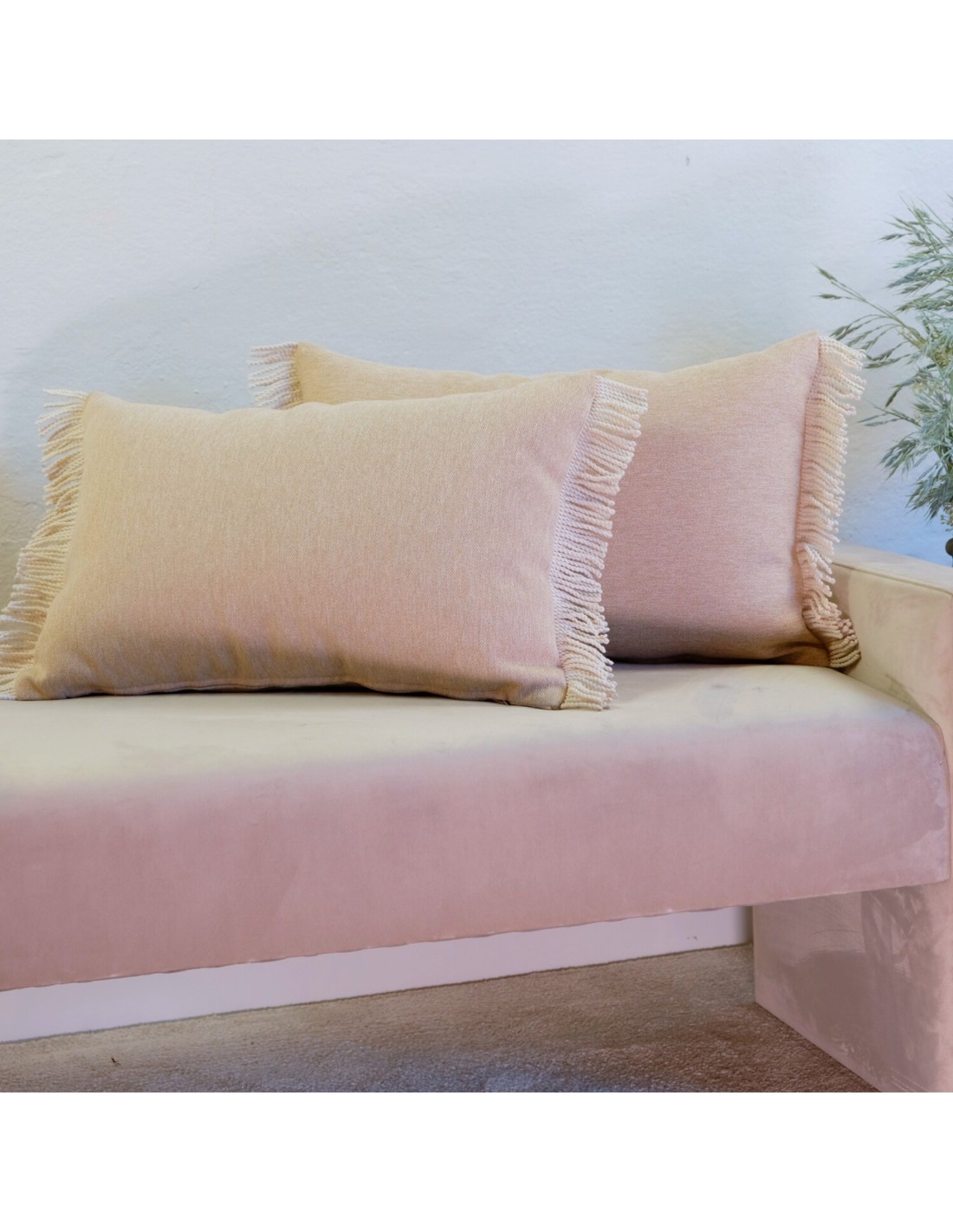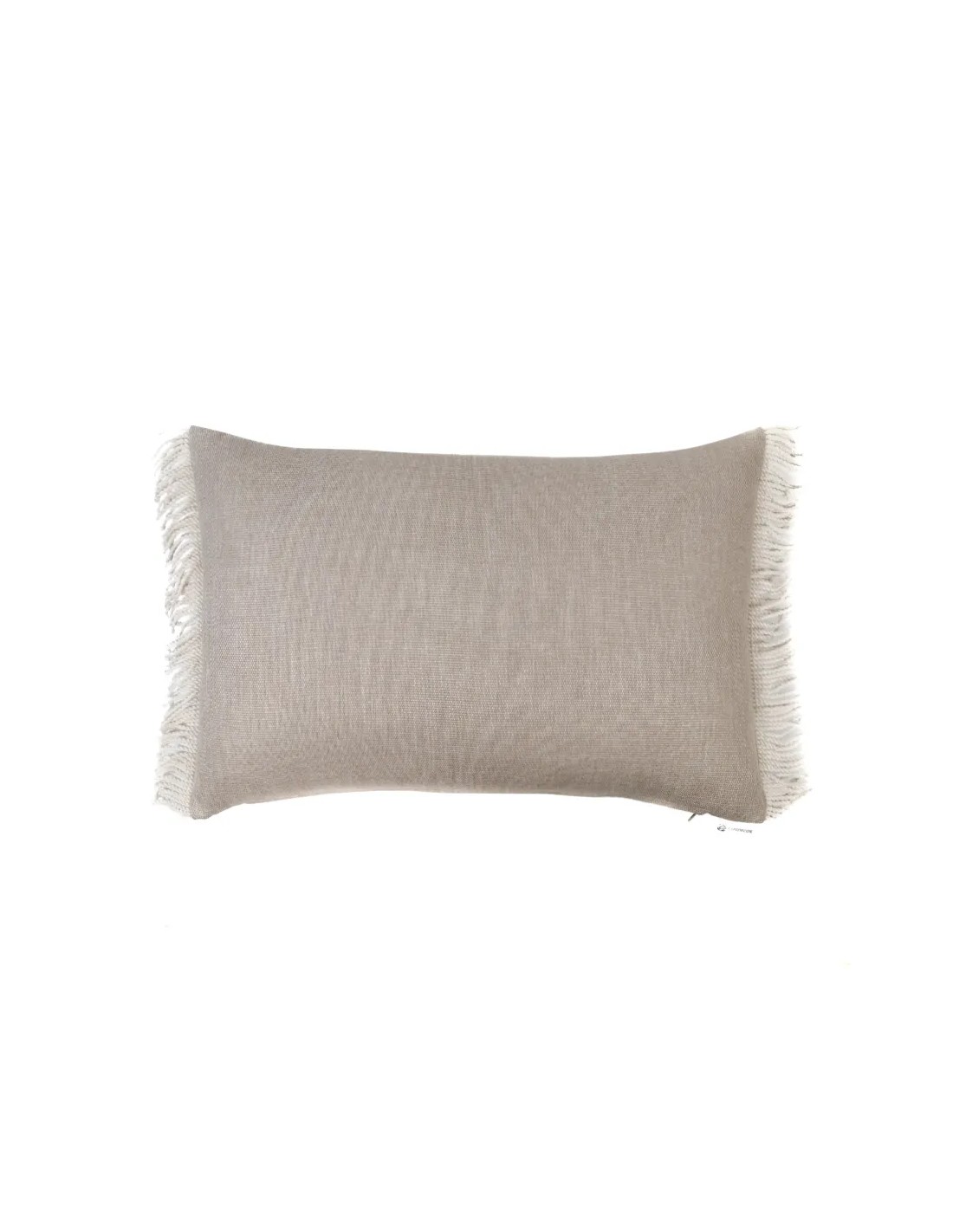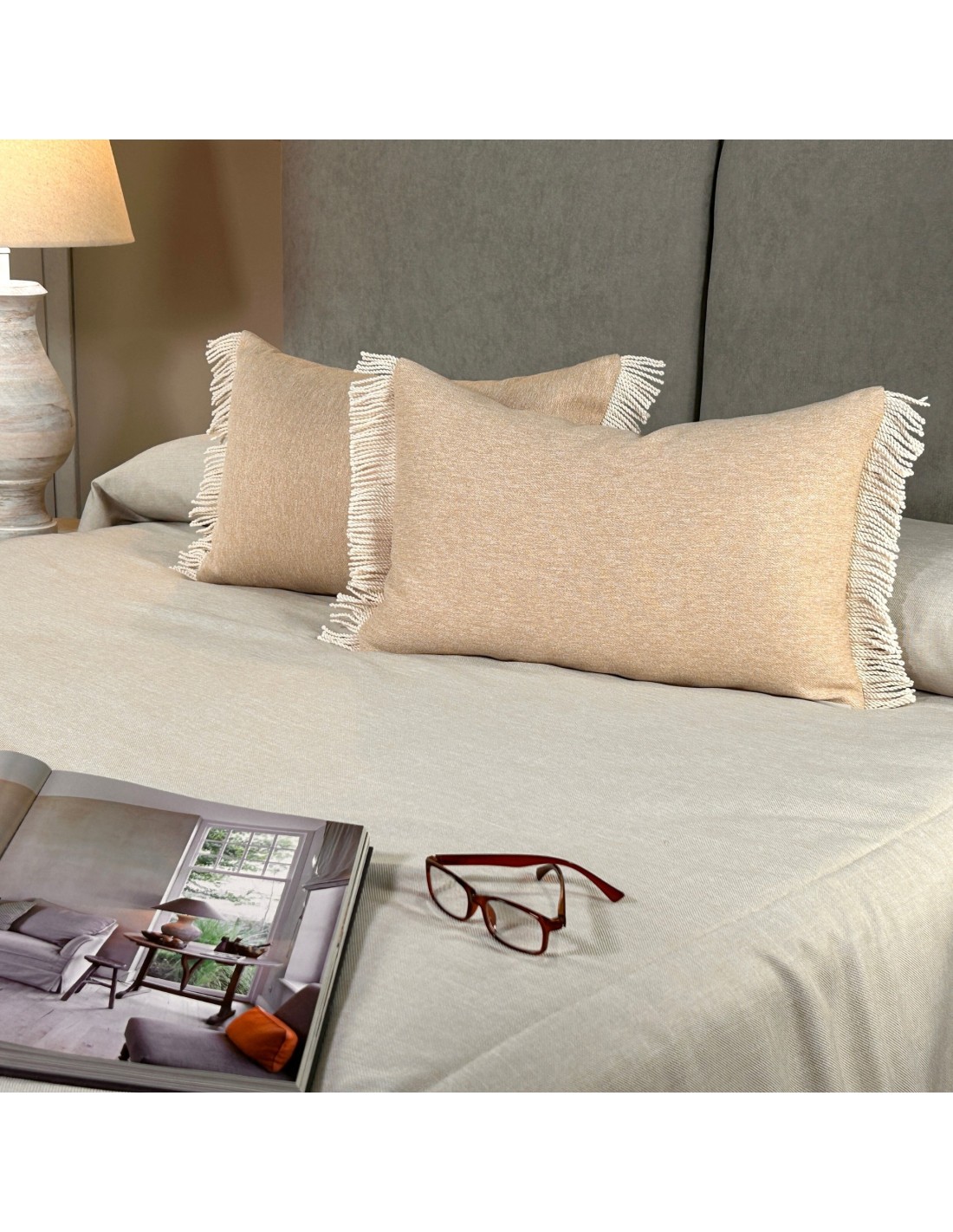 Funda Cojín beige marrón fleco rafia y doble tira central 60x30. Colección Nature