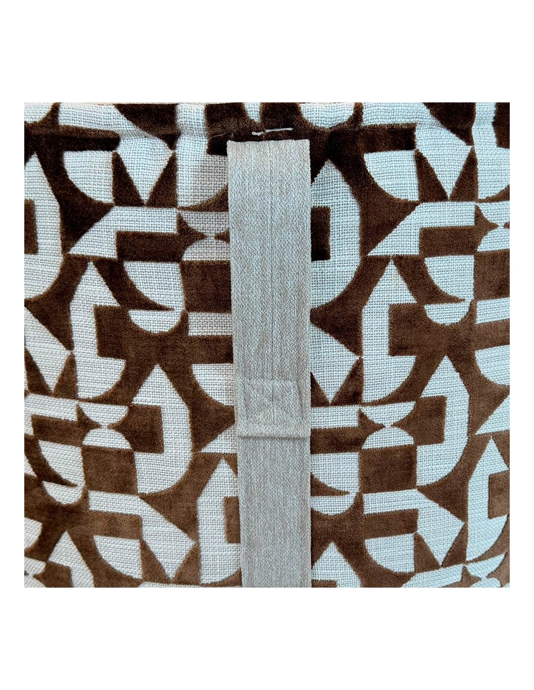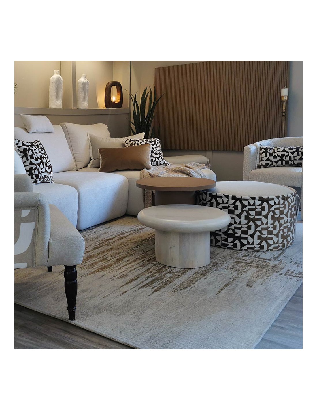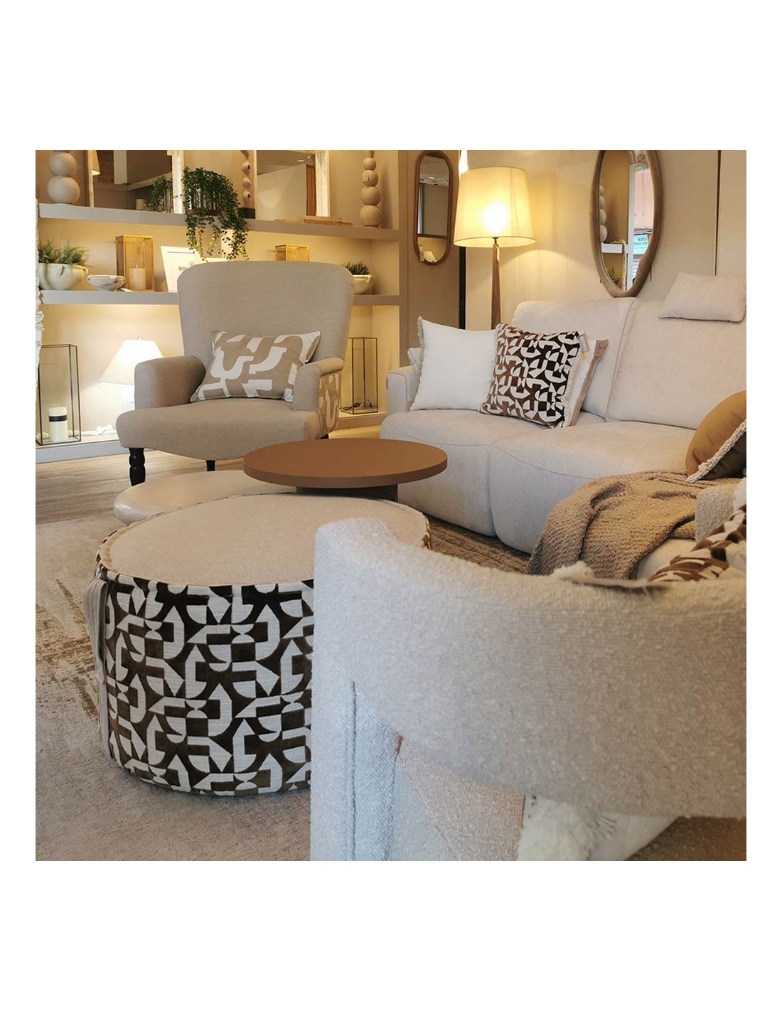 Pouff redondo70x70x43 cm modelo Aura Round, terciopelo geométrico bronce en laterales y terciopelo lavable antimancahs beige en la tapa
