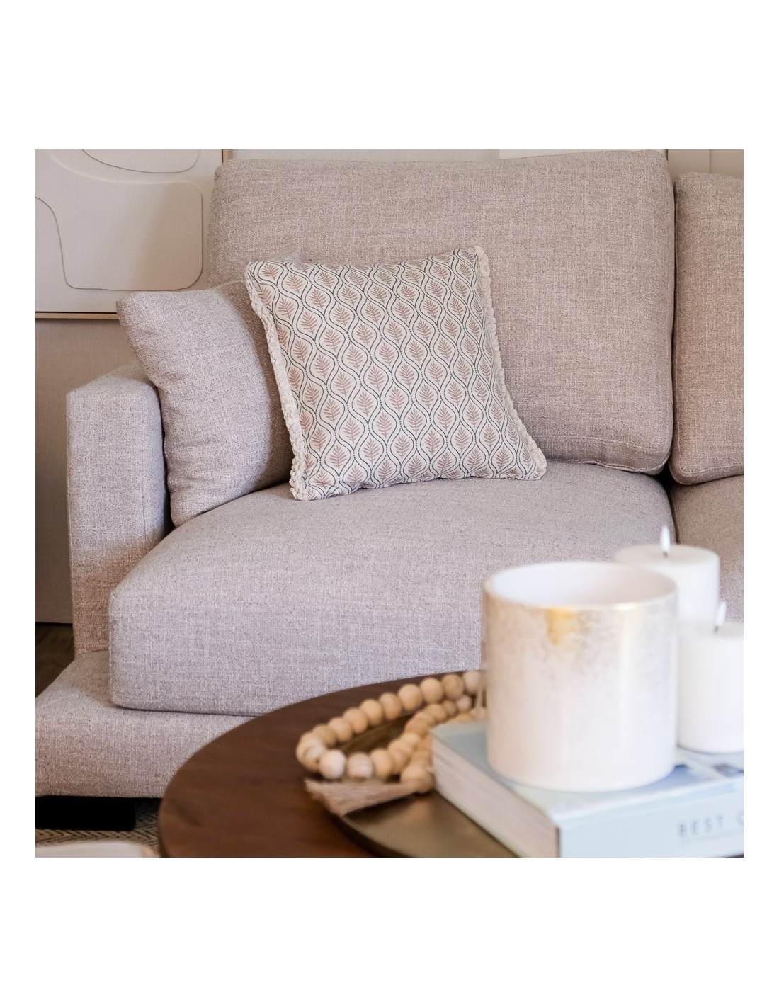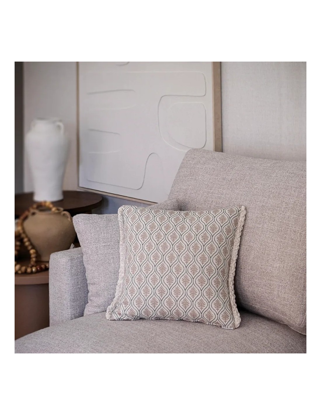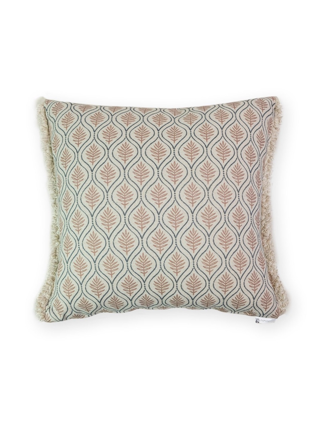 Cojín 50x50 hoja rosa palo fleco espumillón Confeccionado a Mano, Tejido lavable 15º Composición:85% ALG, 15% LINORelleno Premium Incluido
