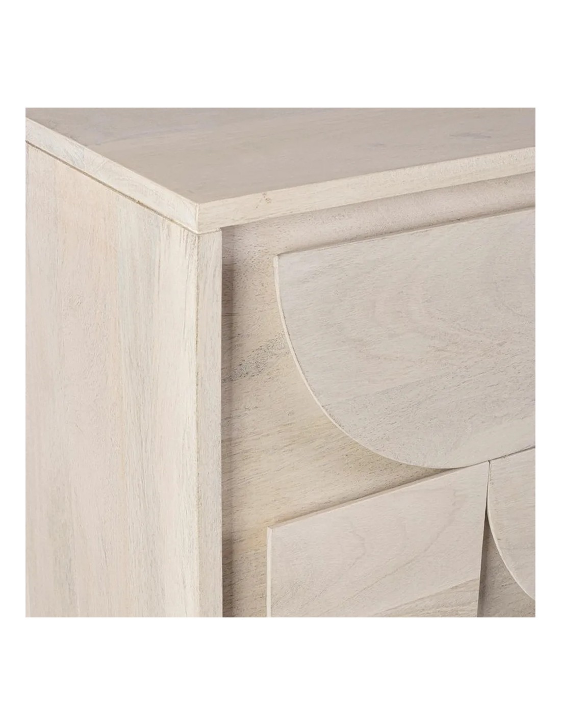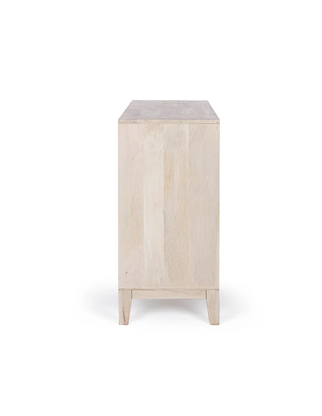 ESTRUCTURA DE MADERA DE MANGO, DORSO DE DM. ACABADO A BASE DE NITROCELULOSA DECAPADO BLANCO. EL COMPARTIMENTO DE LA PUERTA INCLUYE UN ESTANTE.