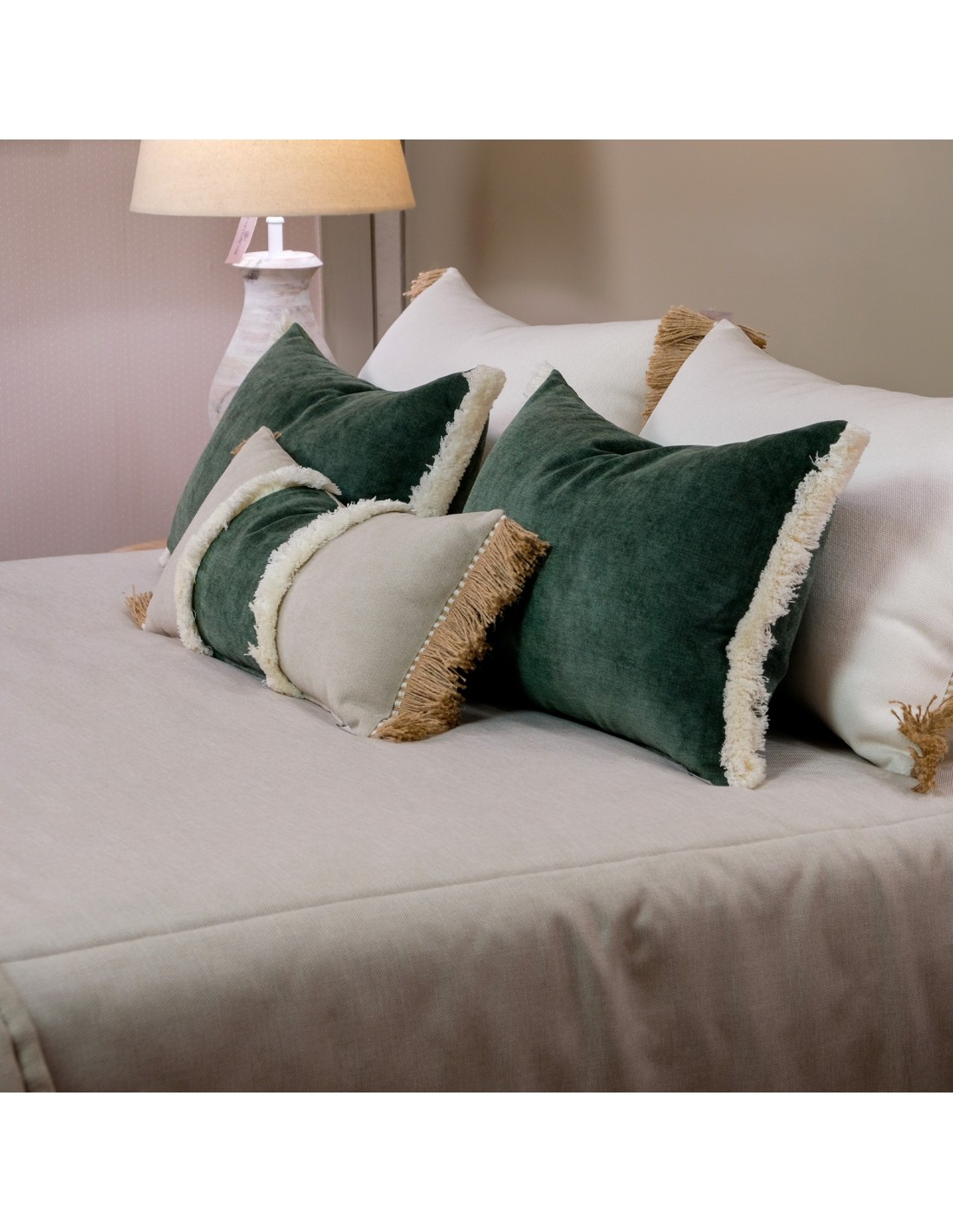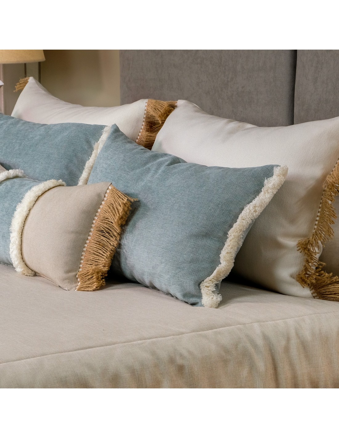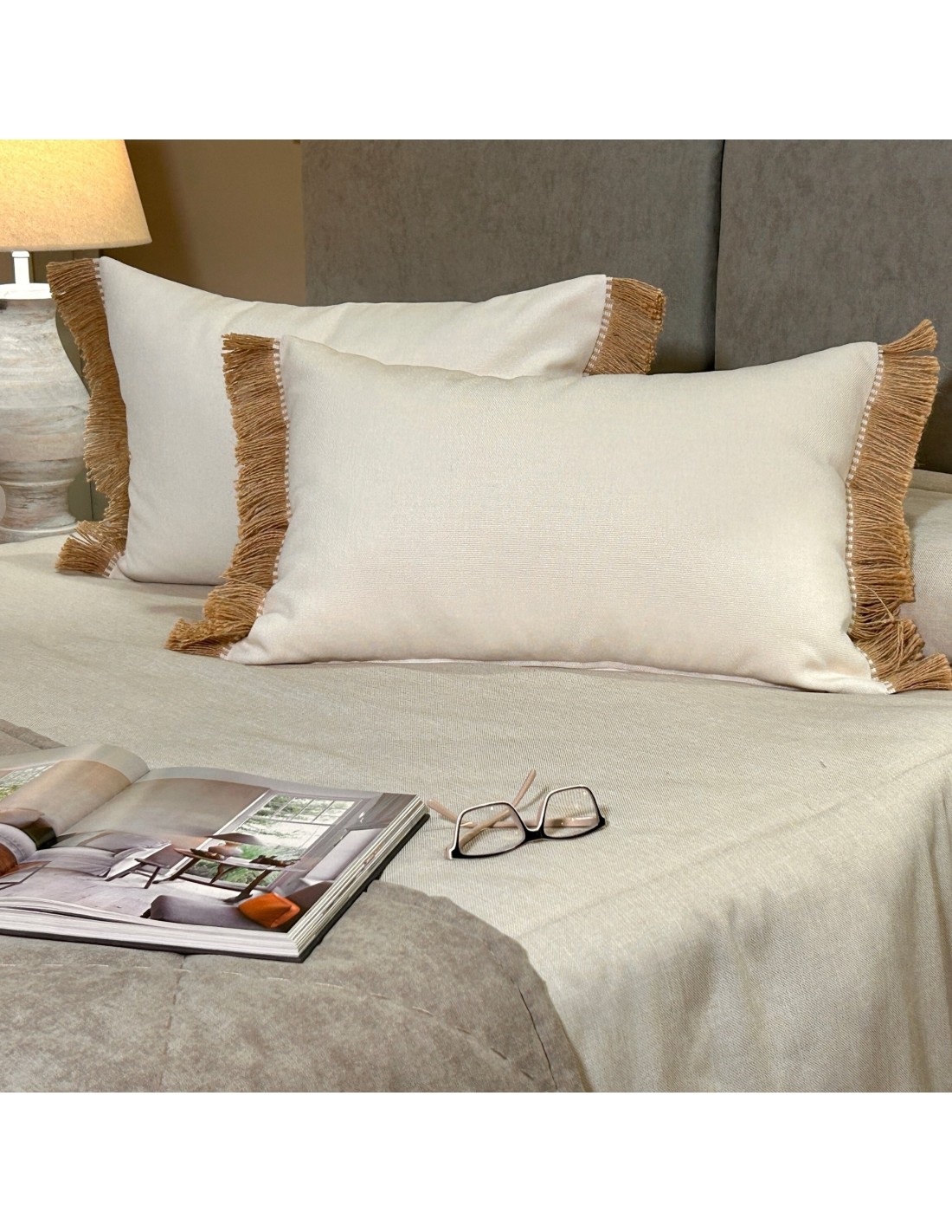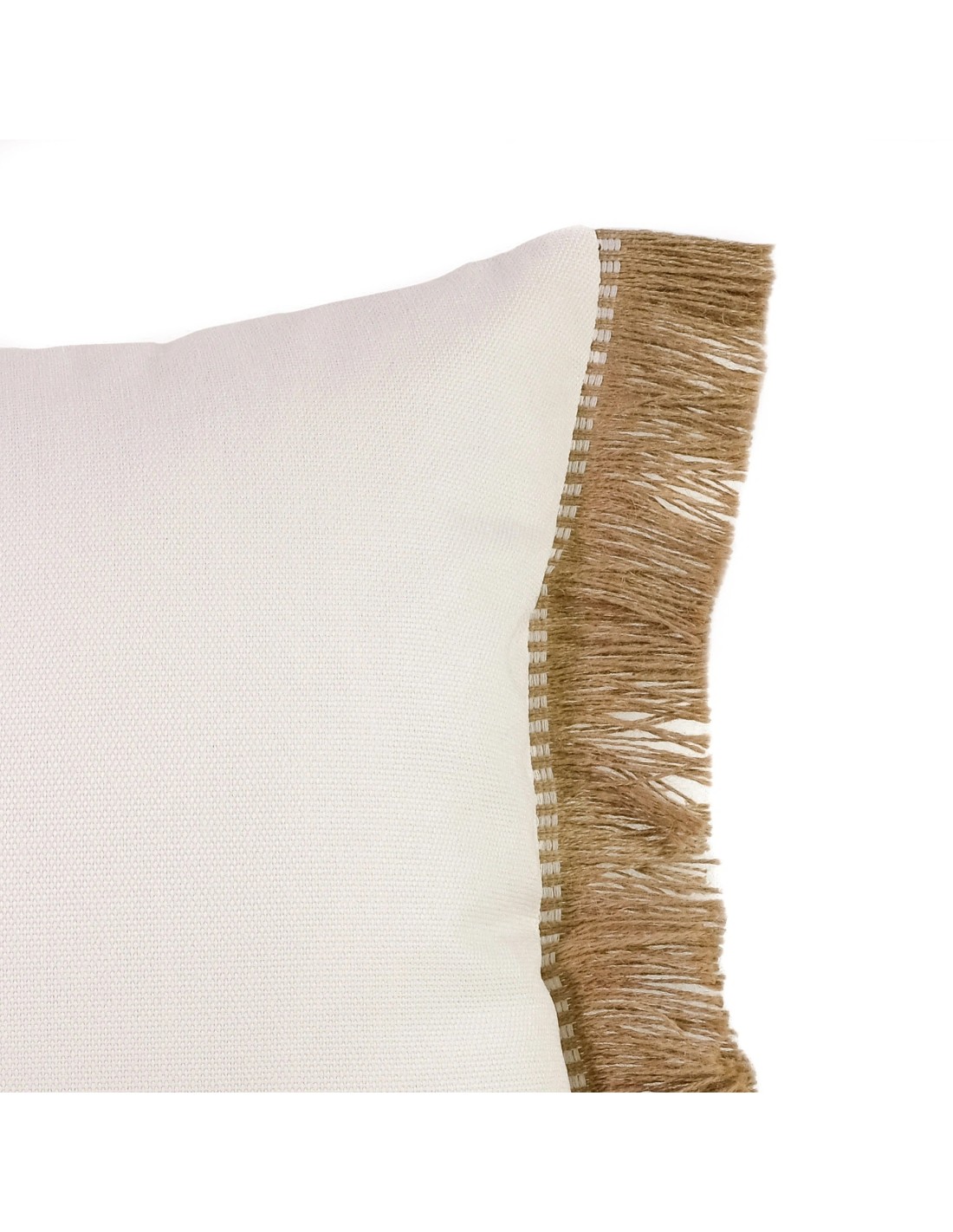 Cojín rectangular liso blanco roto relleno pluma fleco rafia 70x50
