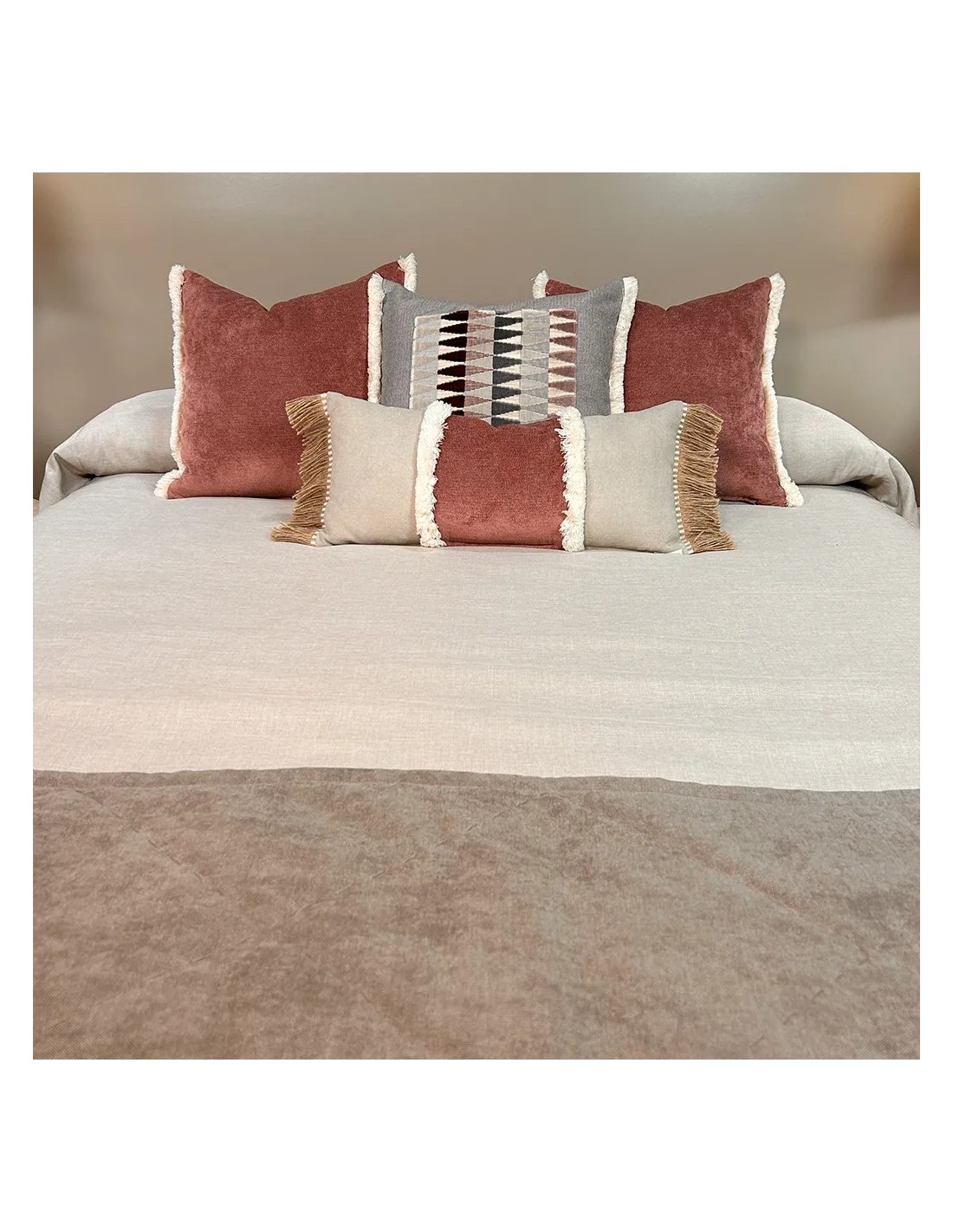 Cojín cuadrado cama sofá liso rosa amoratado relleno pluma fleco blanco 50x50