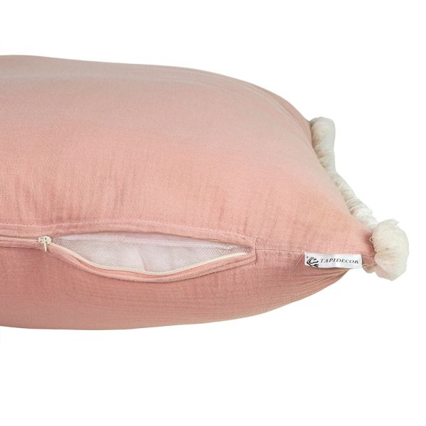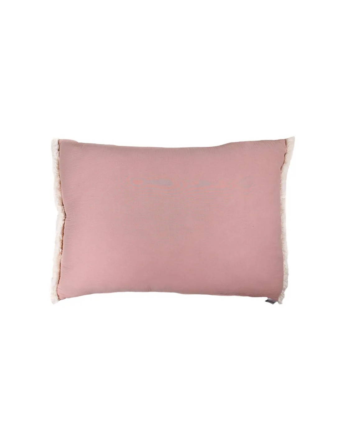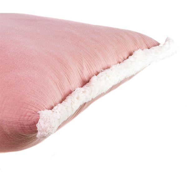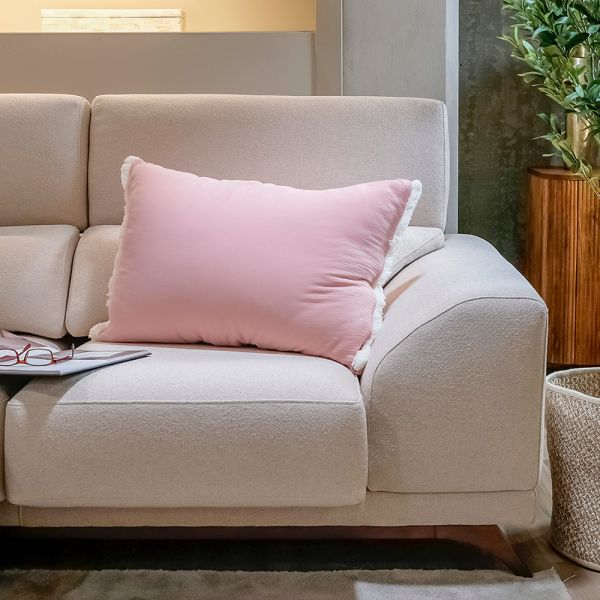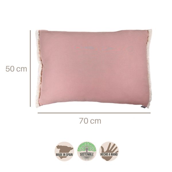 Cojín rectangular sofa cama liso bámbula rosa relleno pluma fleco blanco 70x50