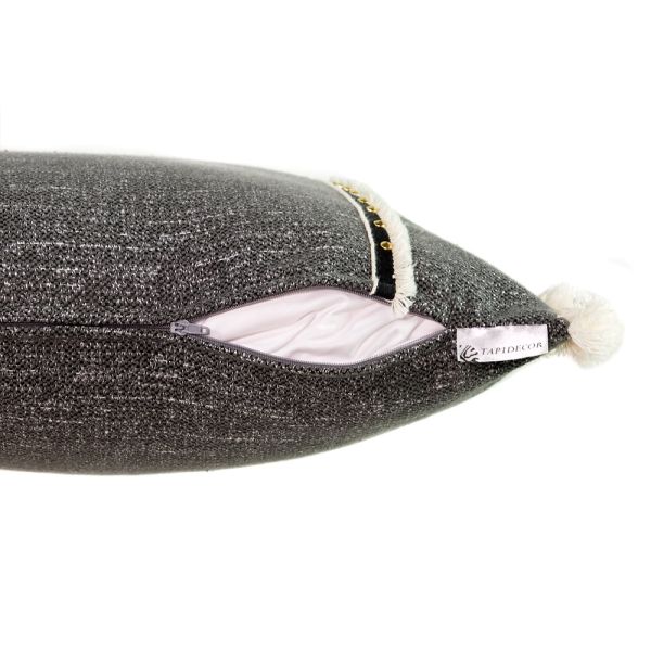 Cojín rectangular cama sofá gris oscuro texturado relleno pluma fleco blanco 50x30