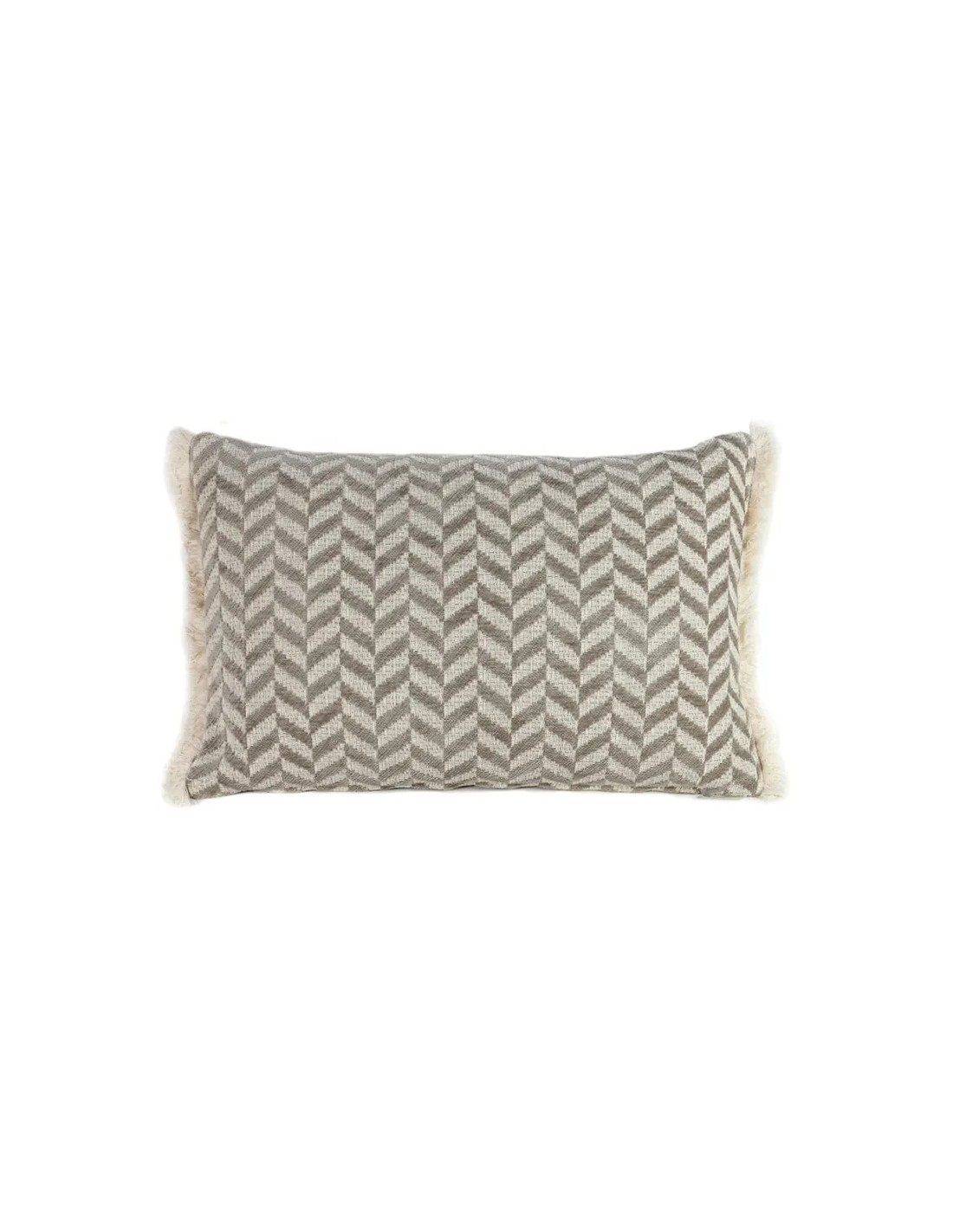 Cojín rectangular cama sofá espiga gris beige relleno pluma fleco blanco 60x40