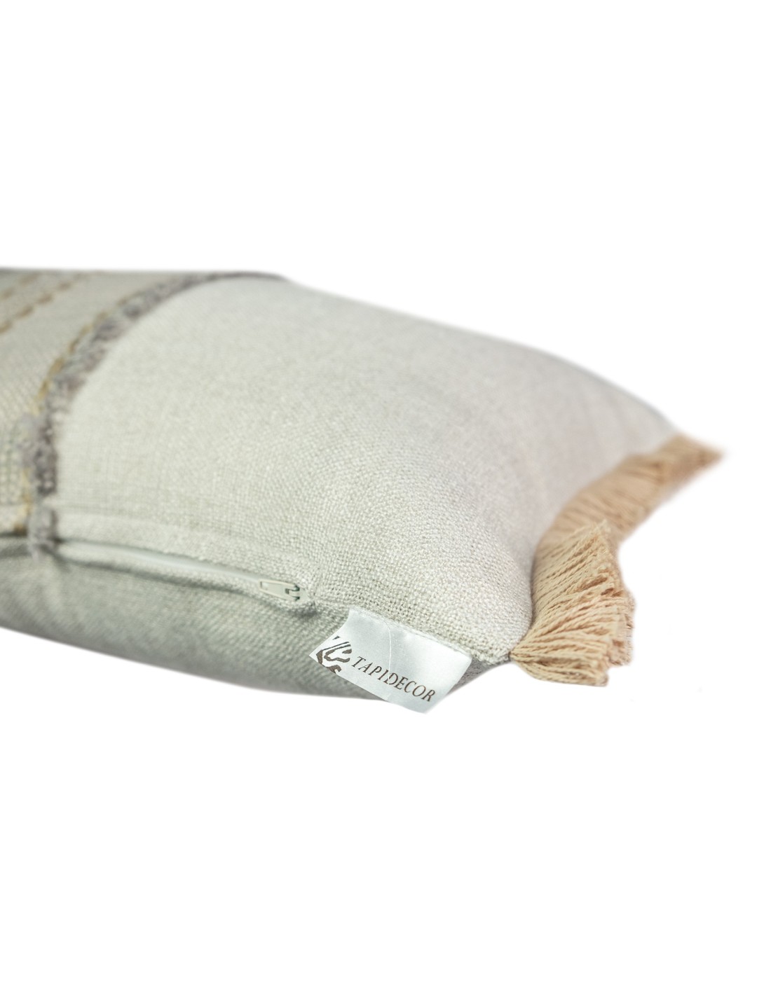 Cojín 50x40 Modelo fleco bandaConfeccionado a Mano, Tejido lavable 15º Composición Tejido principal: 100% POLIESTER Composición Babda central: 45% ALG, 25% POL. 21% LINO, 9% LANARelleno Premium Incluido