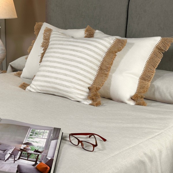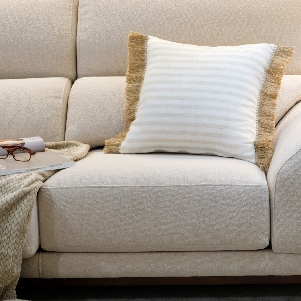 Cojín rayas camel blanco fleco rafia 50X50 Relleno Premium incluido