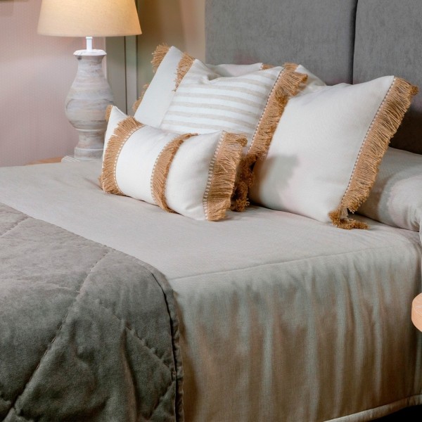Cojín 50x50 Modelo fleco rafia 7cmConfeccionado a Mano, Tejido lavable 15º Composición: 100% PoliésterRelleno Premium Incluido