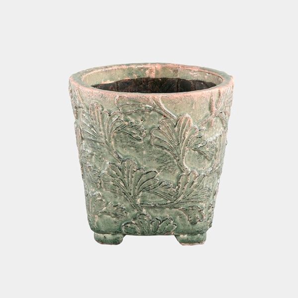 MACETA REDONDA PEQUEÑA CON HOJAS 19X18X19