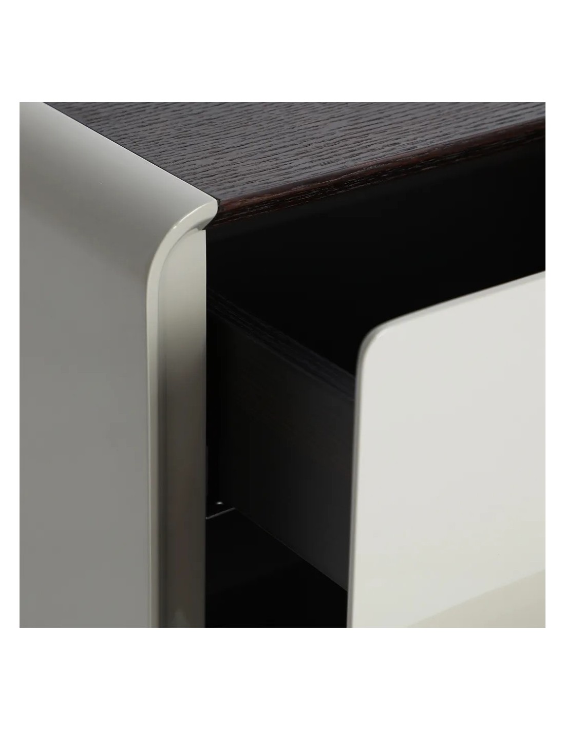 Mesita de noche de madera en gris, combinado con chapa de roble marrón.Minimalismo y funcionalidad. Esta mesita de noche fabricada en madera DM gris con chapa de roble marrón, es la solución perfecta espacios que buscan estética limpia y práctica.
