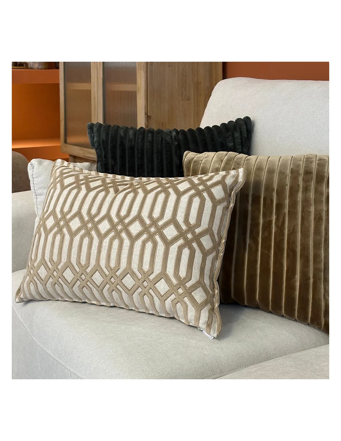 Cojín Geométrico Terciopelo camel pest. mín. 60X40 Relleno premium incluido