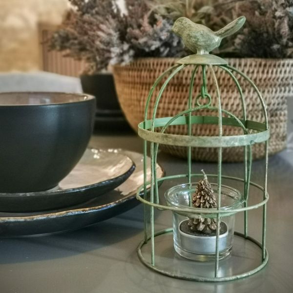 PORTAVELAS METAL PEQUEÑO JAULA PAJARO VERDE DECAPADO 10X19
